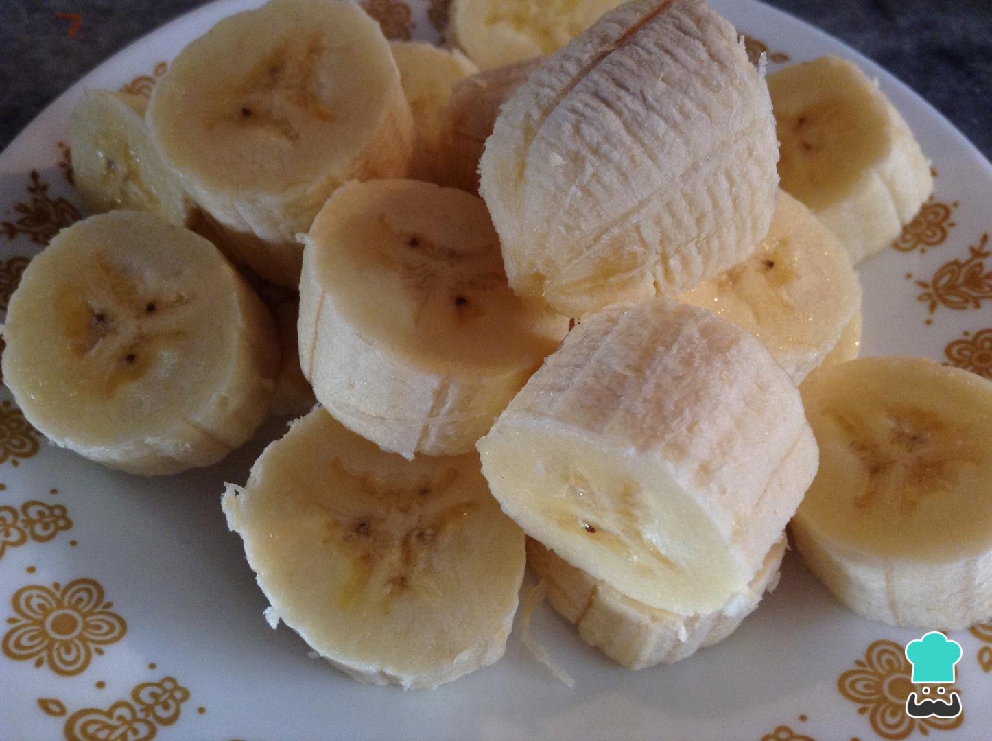 Corta las bananas en trozos de un bocado, como se observa la fotografía.