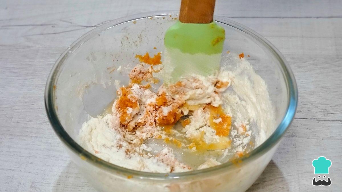 Coloca el puré de calabaza en un bol, añade la harina y el aceite de oliva y mezcla bien con la ayuda de una espátula.