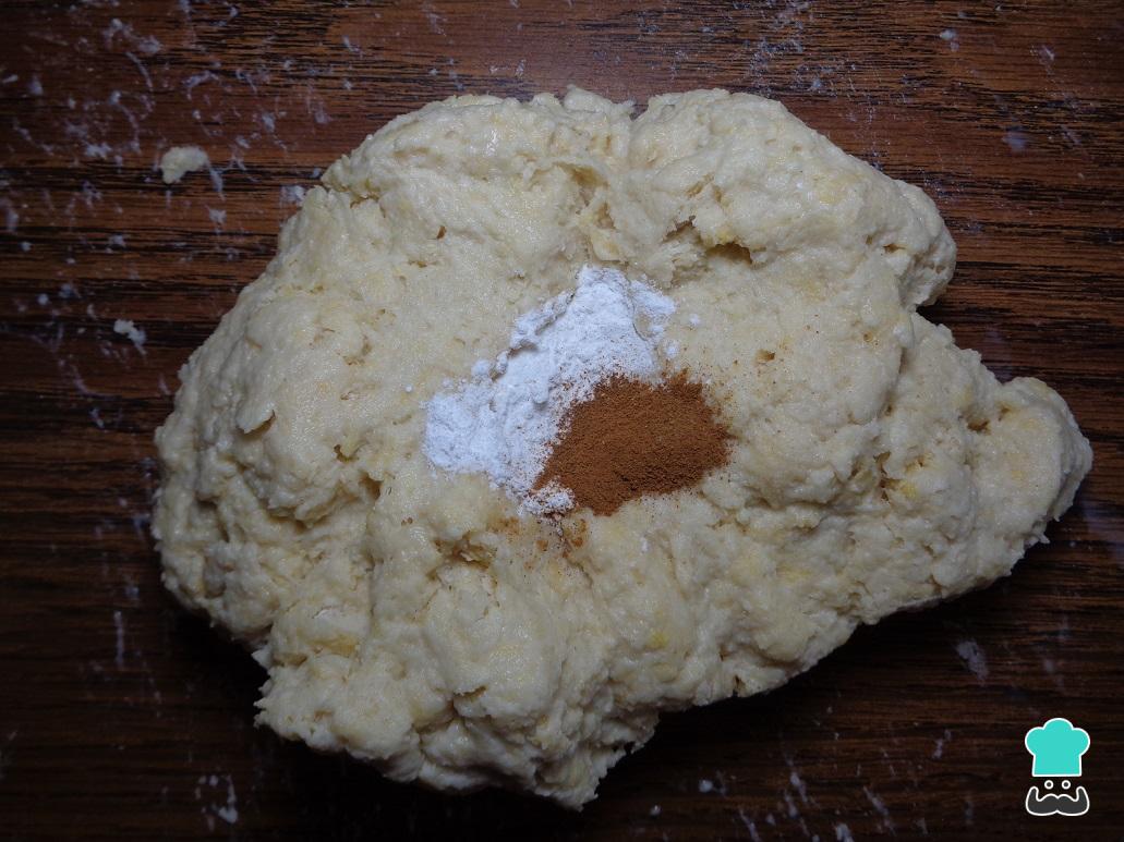 Ahora amasamos perfectamente hasta obtener la consistencia de masa homogénea, a la cual agregaremos el polvo para hornear y la canela, y nuevamente amasamos para integrarlos últimos ingredientes, hasta que la masa de los buñuelos mexicanos sea flexible y suave.
