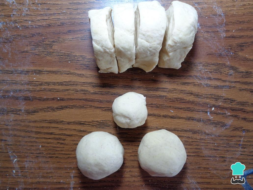 Ahora tomamos la masa de los buñuelos veracruzanos y la dividimos en 8 partes, tomamos cada una de estas partes y con esa masa formamos bolitas.