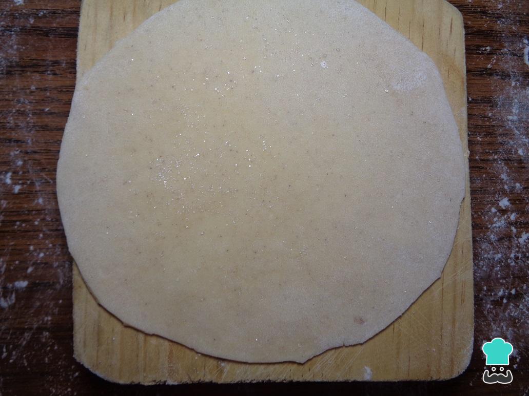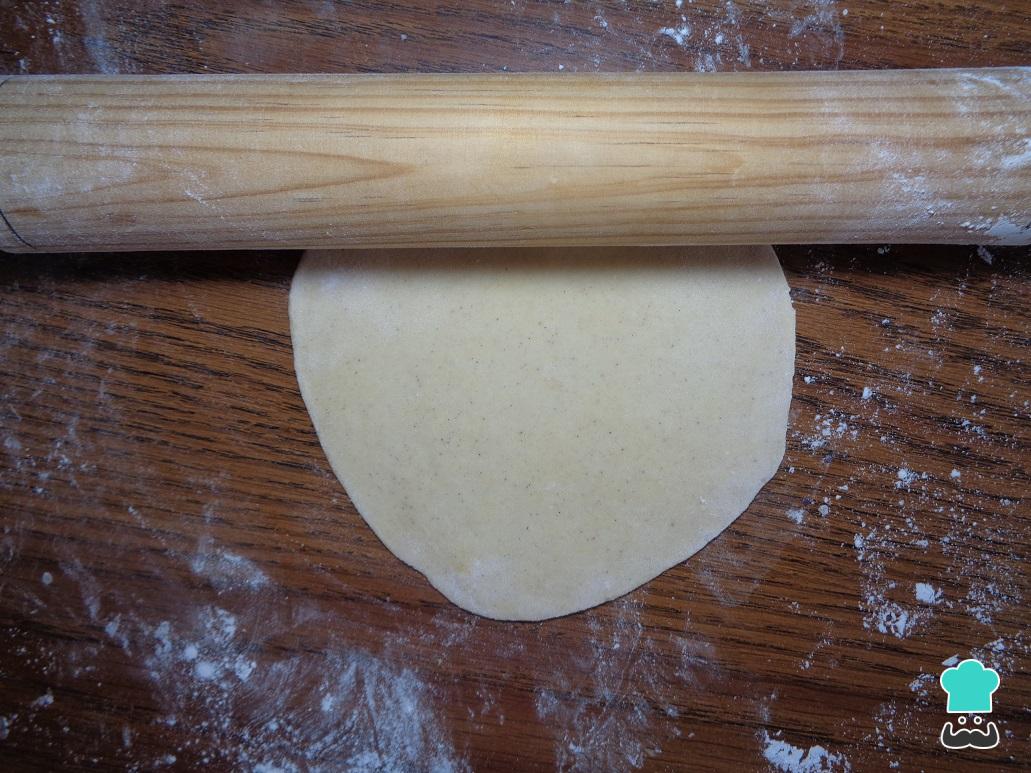 Una vez listas las bolitas, enharinamos con un poco de harina una superficie lisa y un rodillo y comenzamos a aplanar con este las bolitas de masa de buñuelos de la abuela hasta obtener una especie de tortilla delgada.