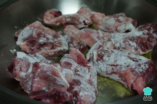 Primero pide al carnicero que corte el cordero en trozos y salpimienta. A continuación, en un plato añade harina y enharina los trozos de cordero. Pon una cazuela amplia con un buen chorro de aceite de oliva a fuego fuerte y coloca los trozos de cordero y dóralos, retira y reserva.