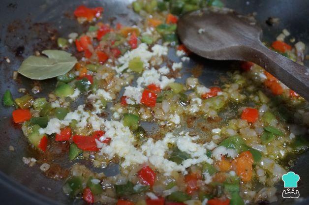 Lava y corta en trozos pequeños el pimiento rojo, el pimiento verde y la cebolla, pícala finamente. Pon un poco más de aceite en la cazuela donde has dorado el cordero, añade la cebolla y el pimiento, deja se poche unos minutos. A continuación, cuando estén medio pochadas las verduras, añade los dientes de ajos picados y la hoja de laurel. Deja que se cocine un par de minutos sin que se queme el ajo.