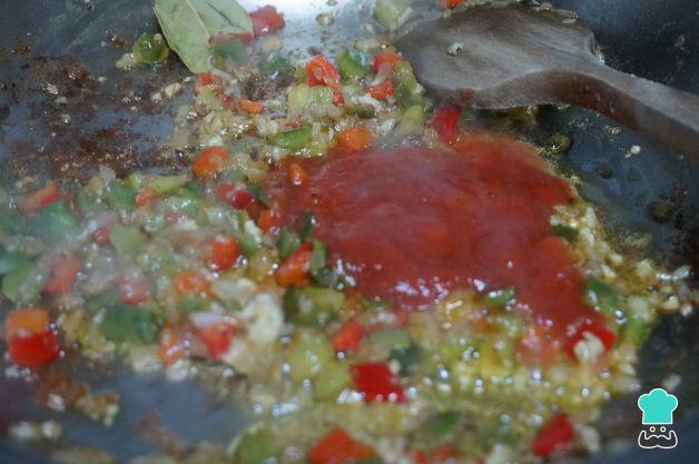 Añade el tomate triturado a las verduras. Deja unos minutos con cuidado que no se pegue.