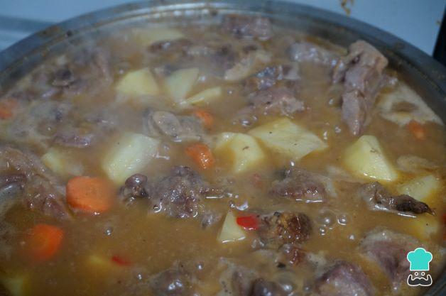 Limpia y corta las zanahorias y las patatas, córtalas en trozos que no sean muy grandes. A continuación, échalas a la cazuela con la carne y deja que se cocine hasta que las zanahorias y las patatas queden cocidas.