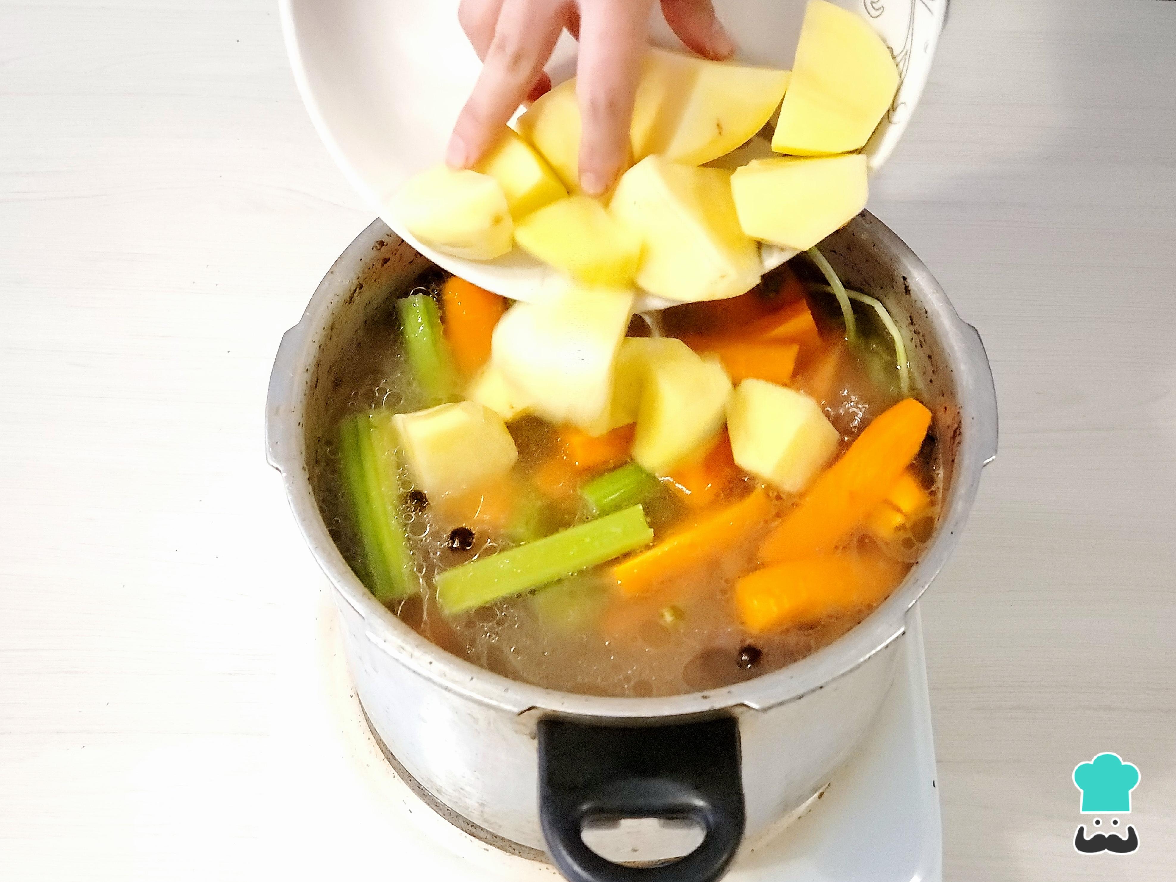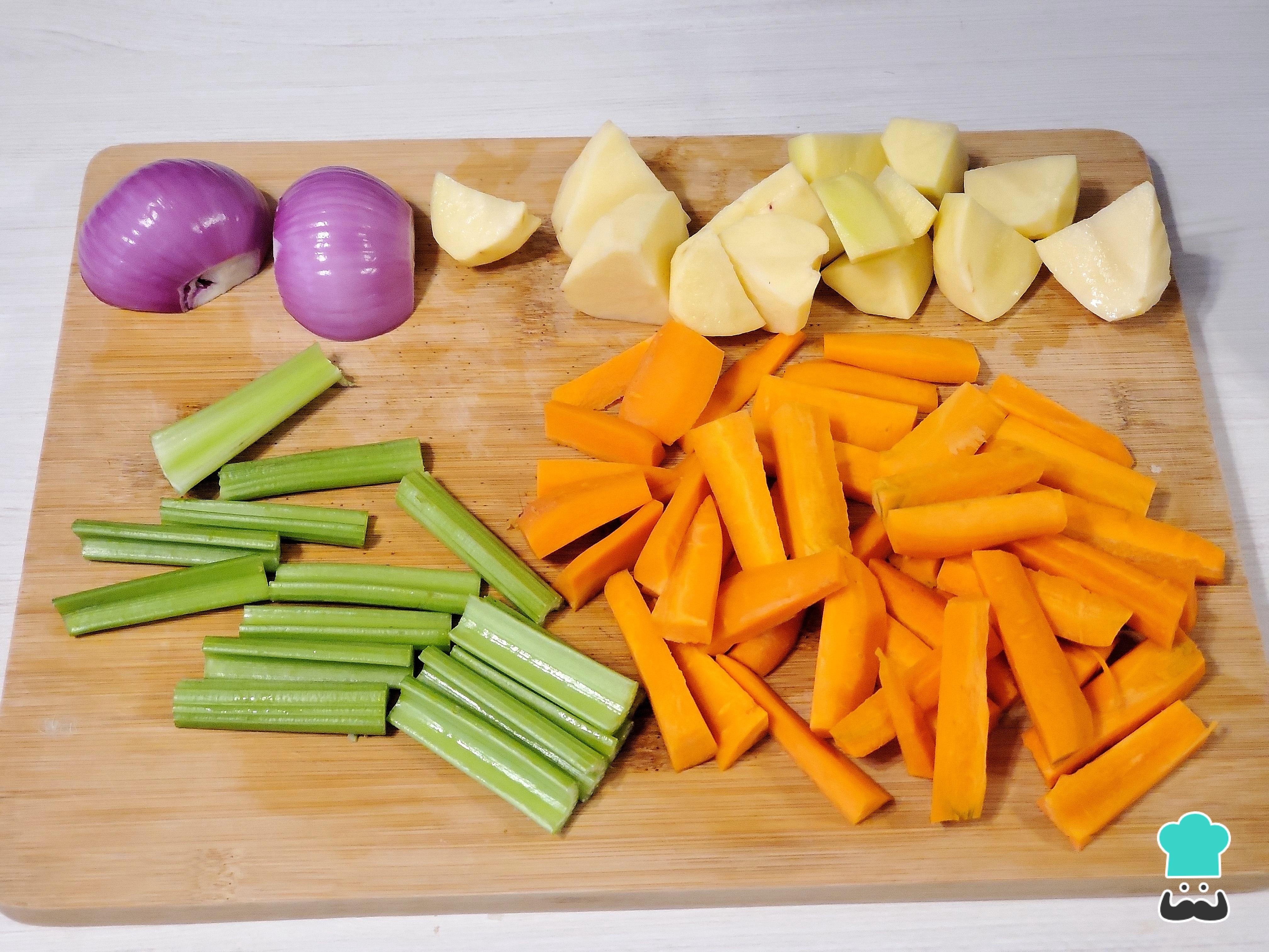 Prepara los vegetales, es decir, lava, pela, corta los extremos de las cebollas y luego pártelas por la mitad. También, lava, pela las zanahorias y procede a cortarlas en bastones gruesos de 5 centímetros de longitud. Corta el apio en bastones del mismo tamaño de las zanahorias. Finalmente, lava, pela y corta las papas blancas en cuartos.