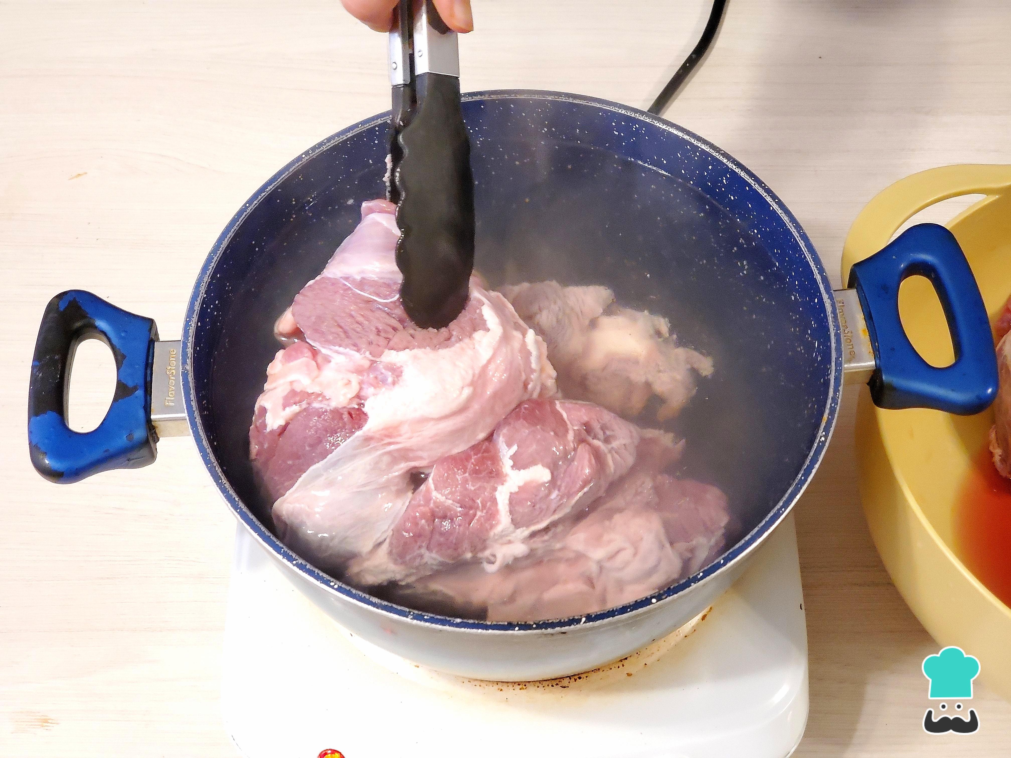 A continuación, limpia el cordero, es decir, retira el exceso de grasa que son las tiras blancas que se distinguen de la carne. Además, si los trozos de cordero están muy grandes córtalos en 2 o 3 partes. Coloca estas piezas en una olla grande con abundante agua con sal.