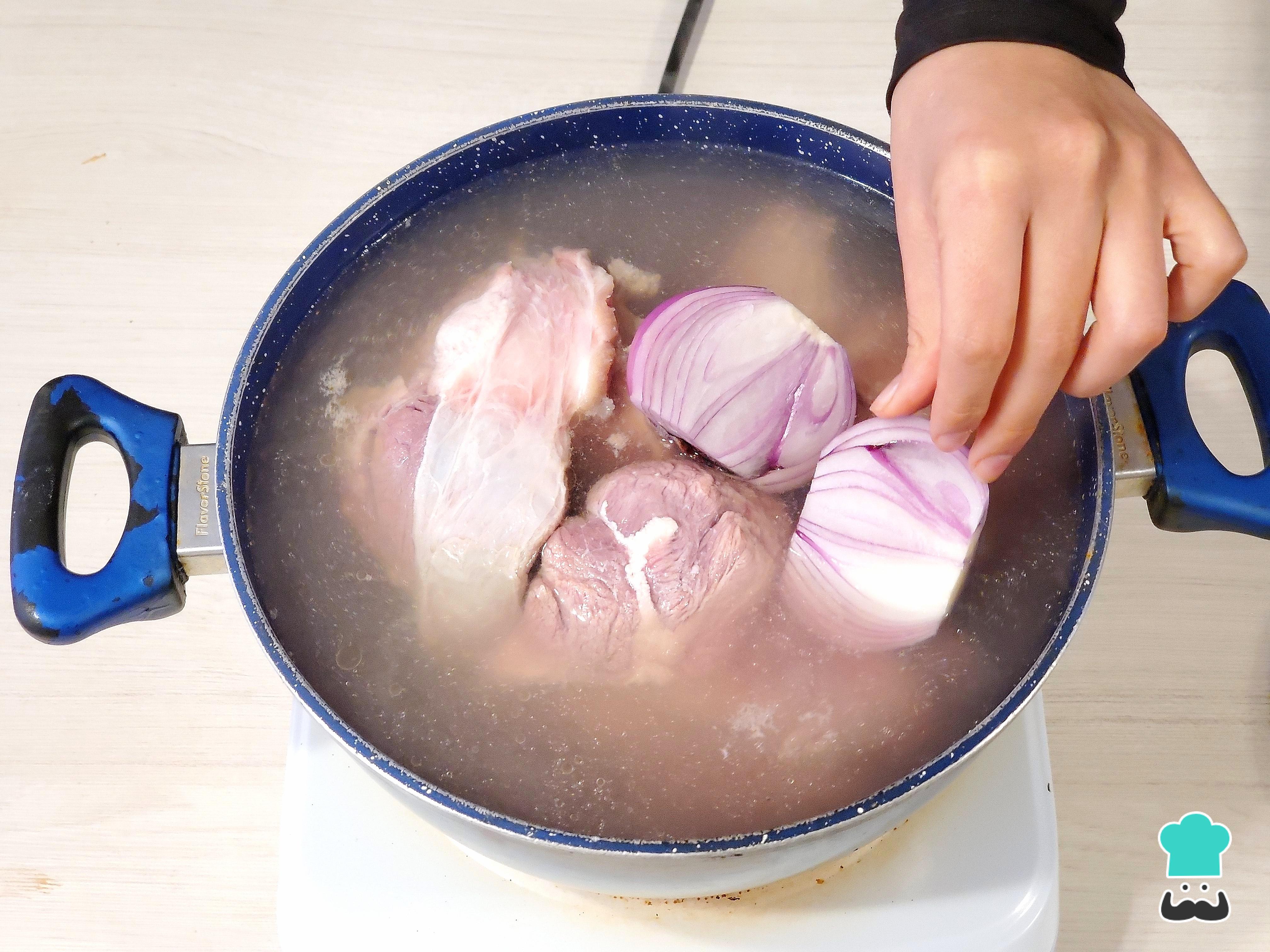 Tapa la olla, reduce el fuego y deja que rompa hervor. Con una espumadera o un cucharón, retira las impurezas que van flotando a la superficie y después de 10 minutos añade las cebollas en mitad y los dientes de ajo. Vuelve a tapar y deja que cocine por lo menos 40 minutos.
