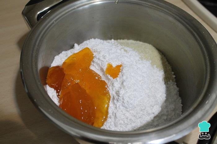 Para hacer nuestros calissons d'Aix, ponemos en una olla la almendra molida, los 250 g de azúcar glass y las dos mermeladas. Mezclamos y ponemos al fuego, mezclando constantemente para que la masa no se pegue. Cocemos entre 5 y 10 minutos. La masa se tendrá que despegar de las paredes del cazo.
