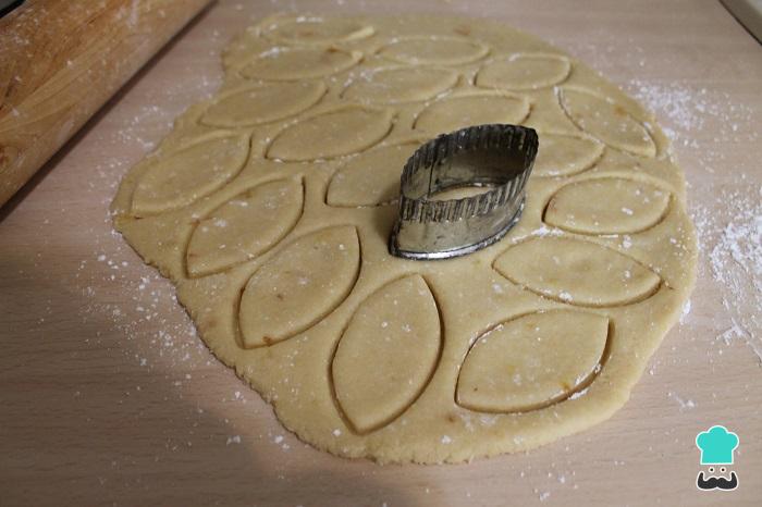 Dejamos enfriar la masa. Luego, enharinamos una superficie de trabajo con azúcar glass o con almendra molida, amasamos un poco la masa y estiramos con un rodillo espolvoreado igualmente con un poco de azúcar pulverizado. Cortamos los calissons con ayuda de un cortapastas, volvemos a amasar los recortes, a estirar y a hacer más calissons caseros. Vamos poniendo cada calisson en una bandeja de horno forrada con papel sulfurizado.