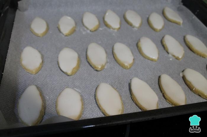 Con una pequeña espátula, ponemos un poco de glasa en la superfice de cada calisson. Dejamos reposar los dulces franceses unos 10 minutos mientras precalentamos el horno a 150 ºC. Cuando el horno esté caliente, apagamos y metemos la bandeja en el horno. Sacamos 5 minutos después, dejamos enfriar los calisson 5 minutos y los pasamos a una rejilla para que se terminen de enfriar. Ya estarán listos para consumir.