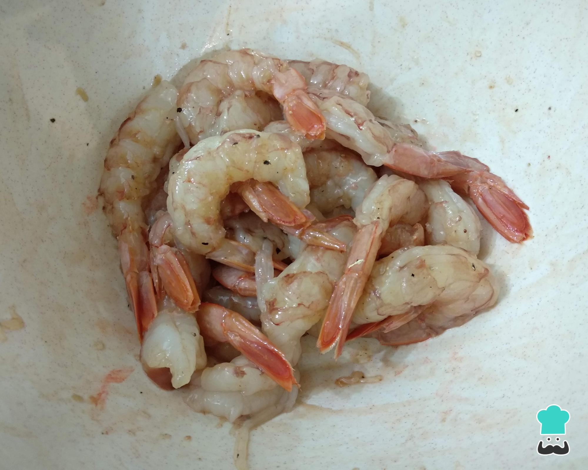 Empieza preparando los camarones: pélalos dejando solo parte de la cola y, usando un cuchillo, haz un corte en la parte superior del marisco longitudinalmente para quitar la tira negra que tiene encima. Sazónalos con la pimienta, la sal y el ajo molido al gusto.