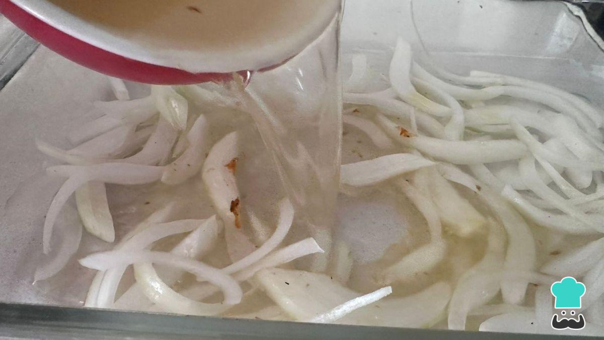 Añade la cebolla en una fuente con el vino blanco o caldo de pollo. La cebolla en la base aportará sabor y evitará que se pegue.