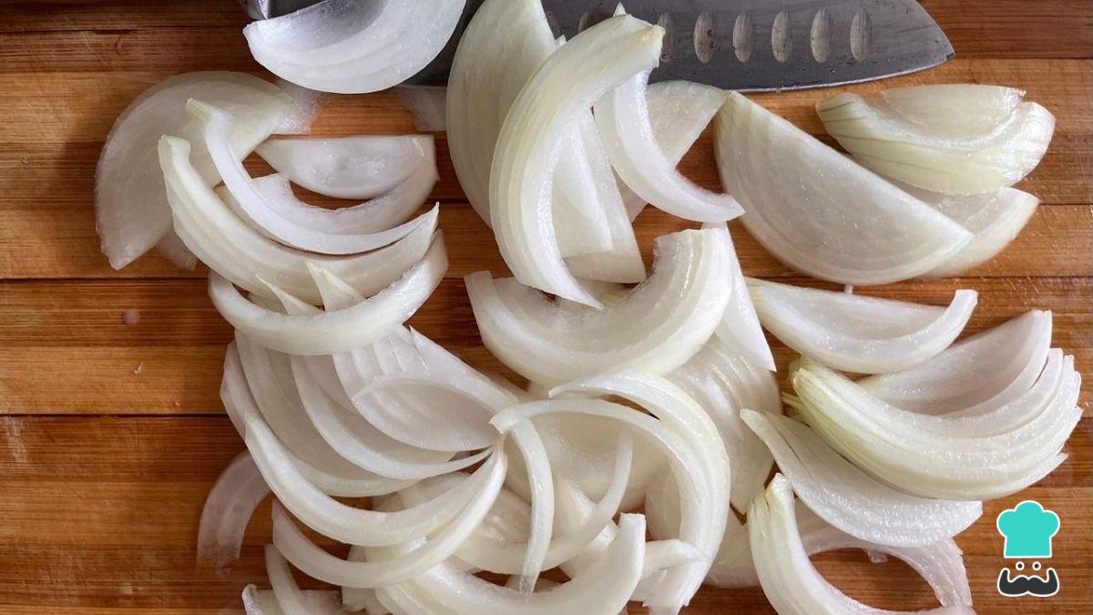 Precalienta el horno a 170 °C con calor arriba y abajo. Corta las cebollas en juliana y pica el ajo en trozos pequeños.