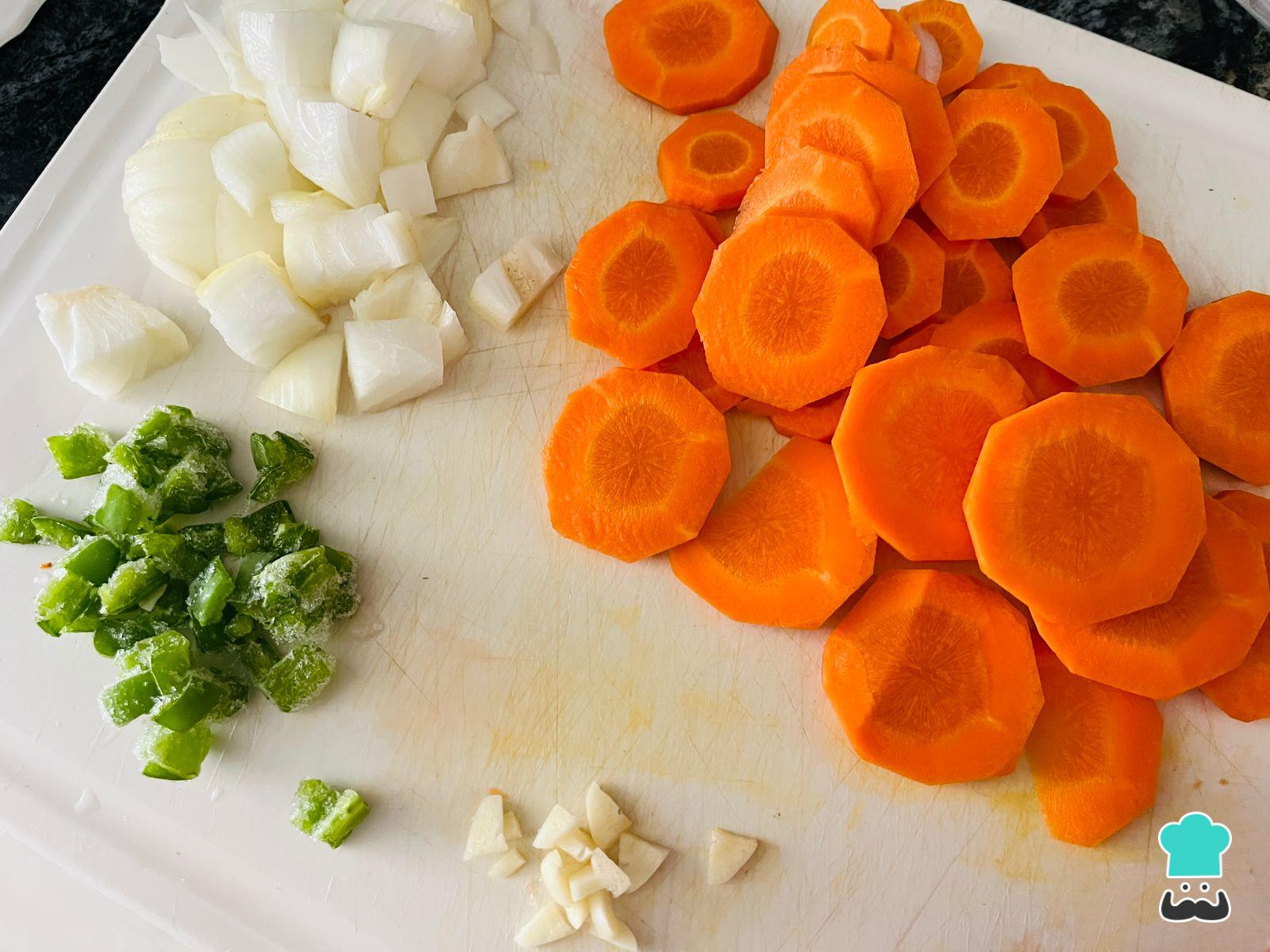Prepara los vegetales de esta receta. Para ello, pela y corta la zanahoria en rodajas, pela y pica la cebolla en cubos no muy chicos, así como el morrón y el diente de ajo. Puedes usar tantos vegetales como tengas o te gusten.
