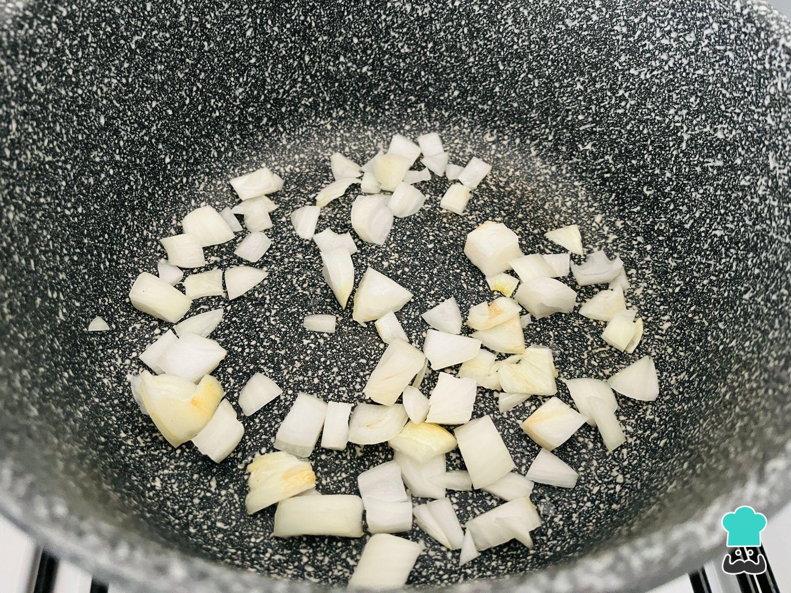Calienta la olla y agrega 1 cucharadita de aceite, añade la cebolla y no la muevas sino hasta que empiece a dorarse. Asegúrate que lo haga de forma pareja.