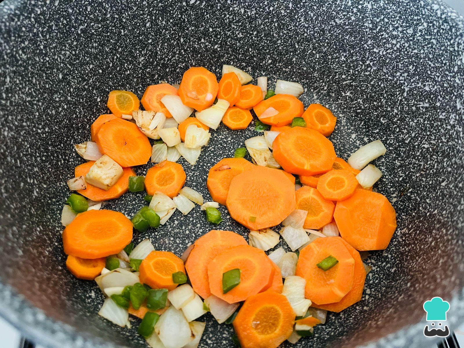 Cuando la cebolla se dore, agrega el resto de las verduras y también dóralas. Cuida el ajo para que no se queme.