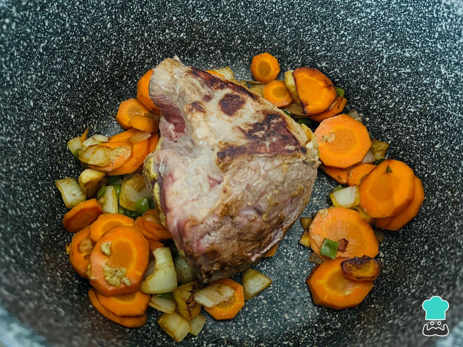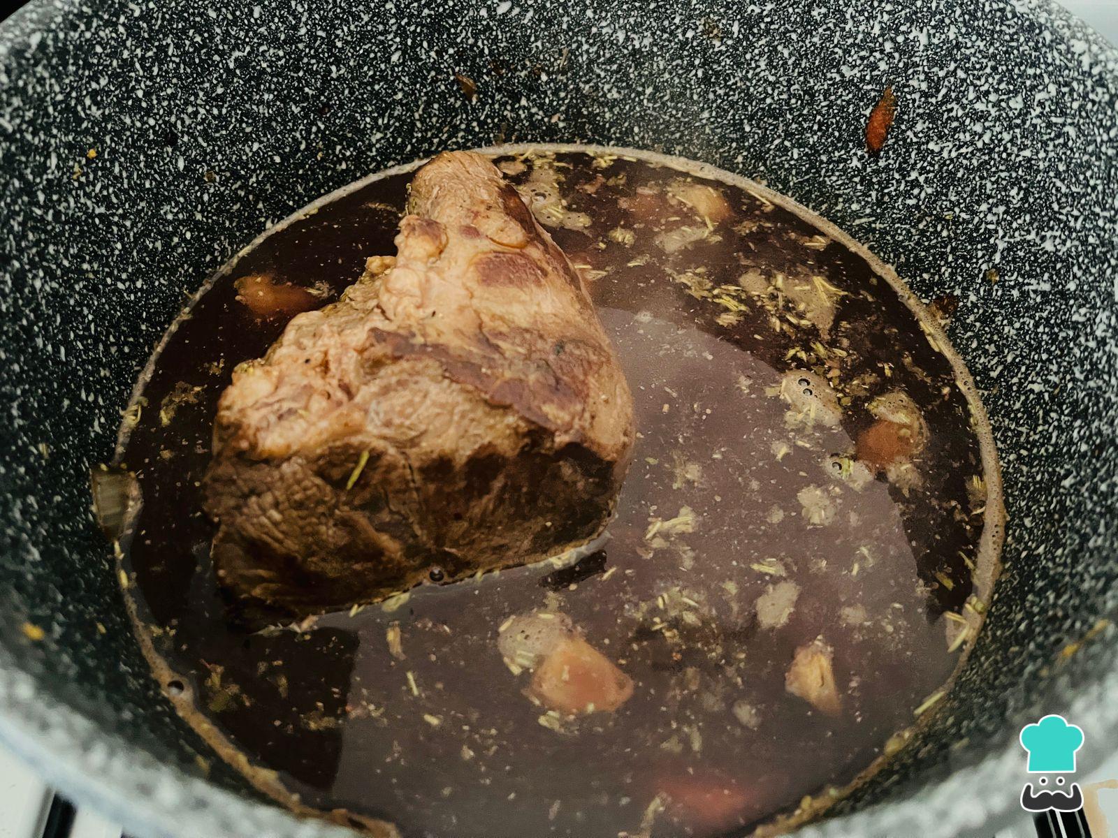 Cubre un tercio de la carne con vino y agua o caldo y agrega condimentos como mostaza, comino, pimentón ahumado. También puedes agregar orégano, romero, pimienta y los condimentos que más te gusten. Tapa y cocina por 1 hora.