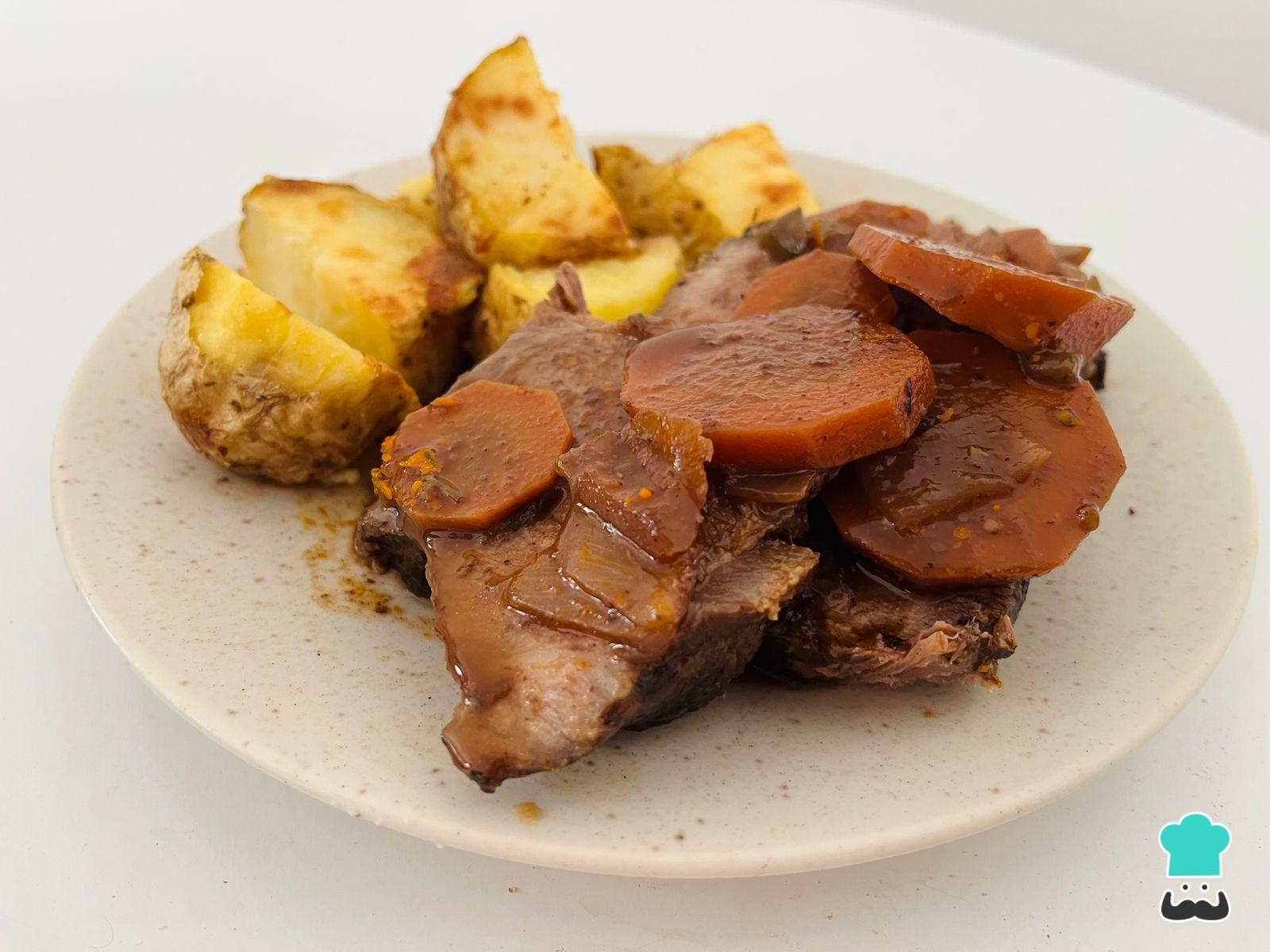 Pasado el tiempo de cocción de la carne con papas, resérvala por 5 minutos. Luego, córtala en rodajas y sírvela junto con el jugo de cocción, las verduras y las papas. ¡A comer! Cuéntanos en los comentarios tu opinión y comparte con nosotros una fotografía del resultado final.