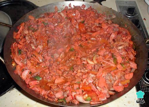 En un cazo grande se pone suficiente aceite y se pone a freier el tocino y la carne de puerco cuando ya este semi cocida la carne de puerco se agrega la carne de res y se le pone un poco de sal, cuando la carne de res esta semi cosida se agrega la 1/2 de la cebolla, la mitad del tomate, el jamón, la salchicha y el chorizo y se agrega lo molido en la licuadora y las cervezas y se deja coser todo por unos 20 minutos.