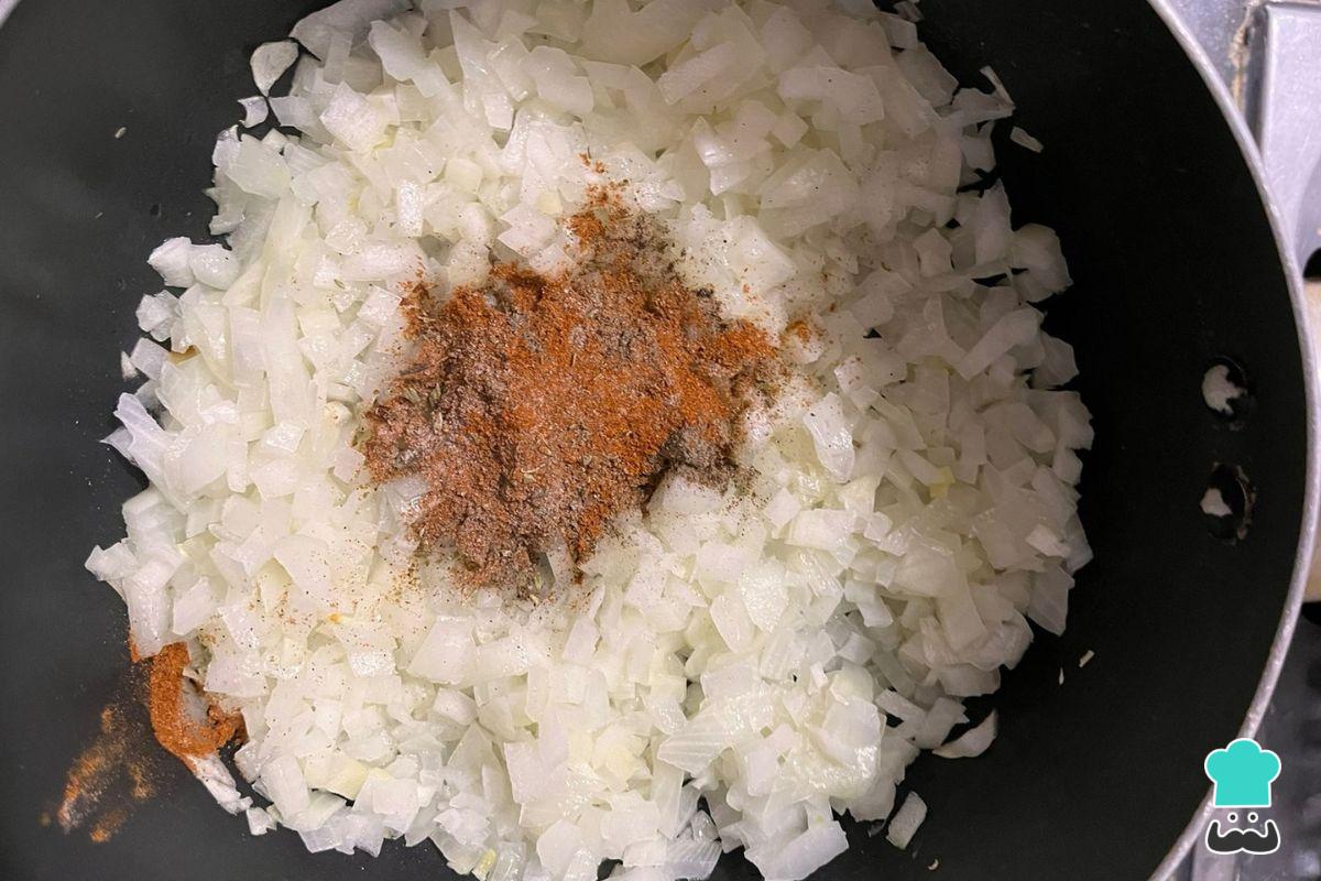 Agrega aceite en una olla o sartén y pon la cebolla a sudar a fuego bajo. A continuación, añade las especias, comino, ají color, orégano, sal y pimienta.