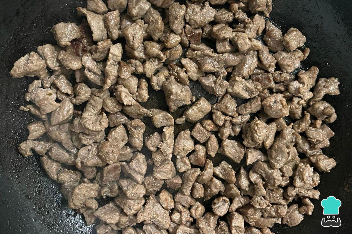 Agrega un poco de aceite al sartén y pon a sellar la carne, que esté dorada por fuera.