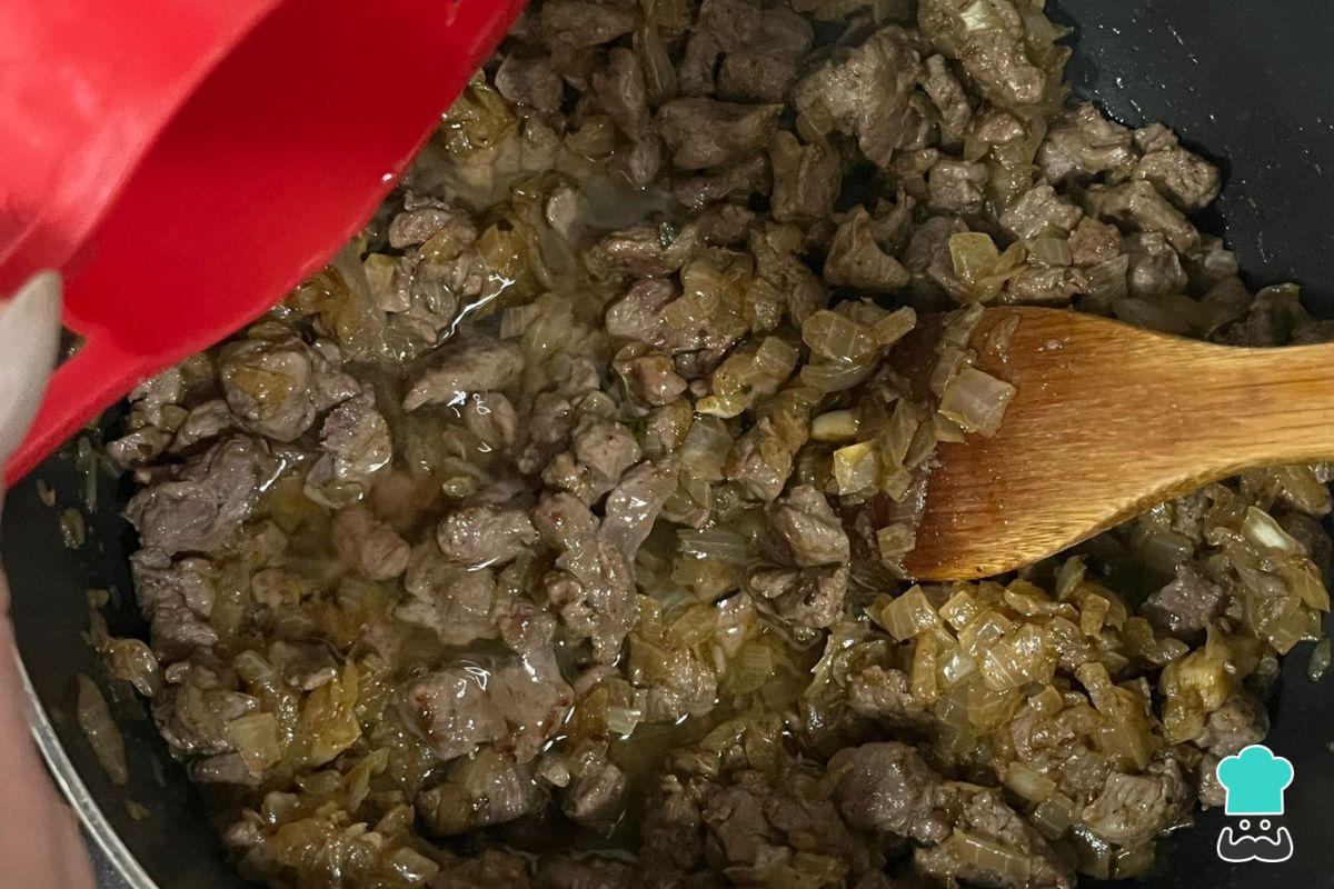 Agrega la cebolla cocida a la carne y vierte la taza de vino blanco.Reduce a fuego bajo, tapa y deja cocinar por 30 a 40 minutos.