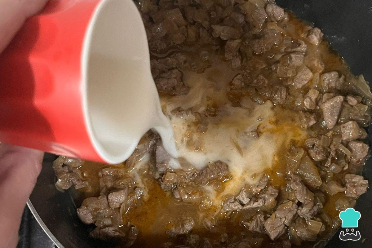 Mezcla bien la taza de agua con la cucharada colmada de harina de trigo y agrégala a la carne.