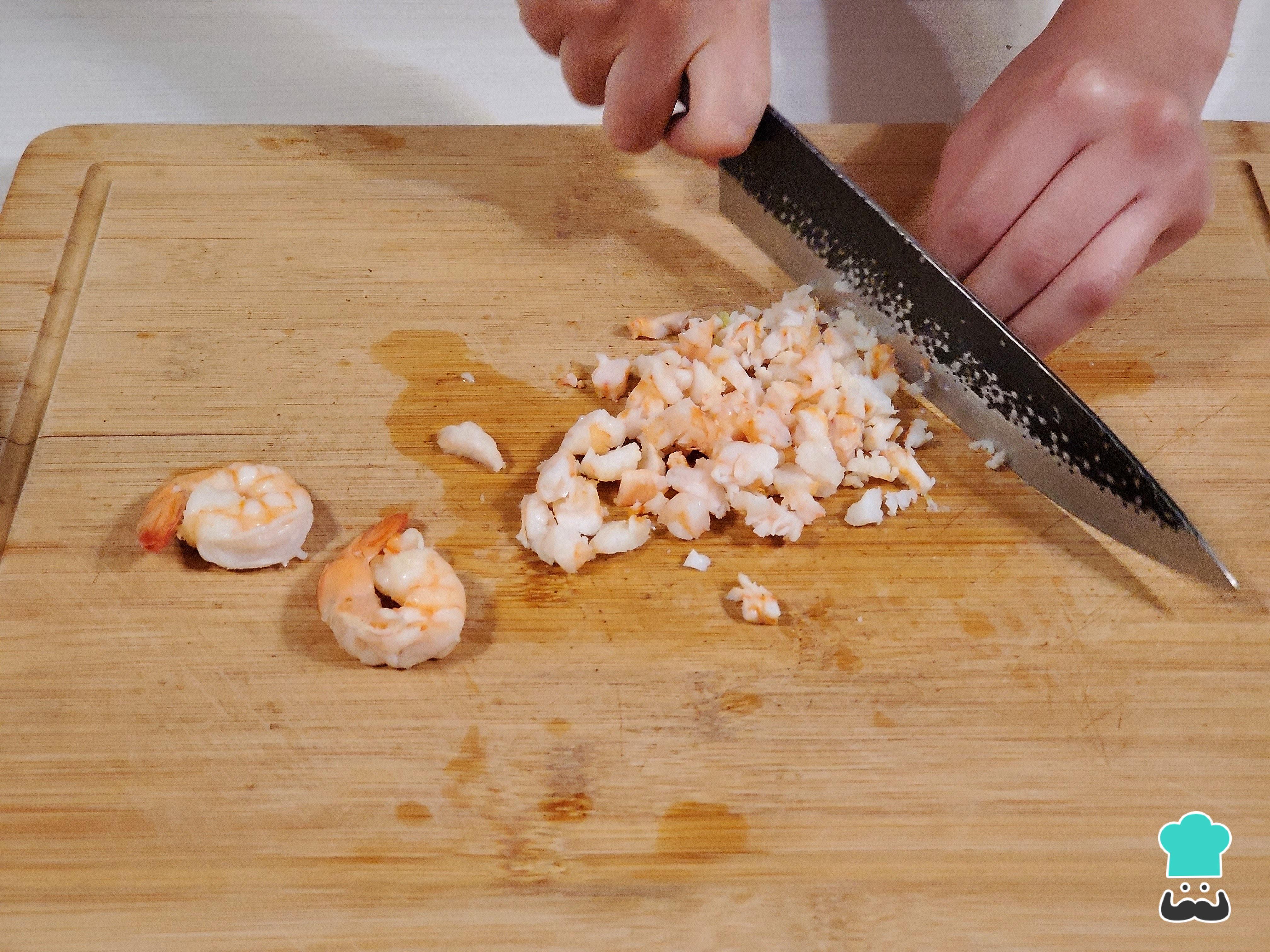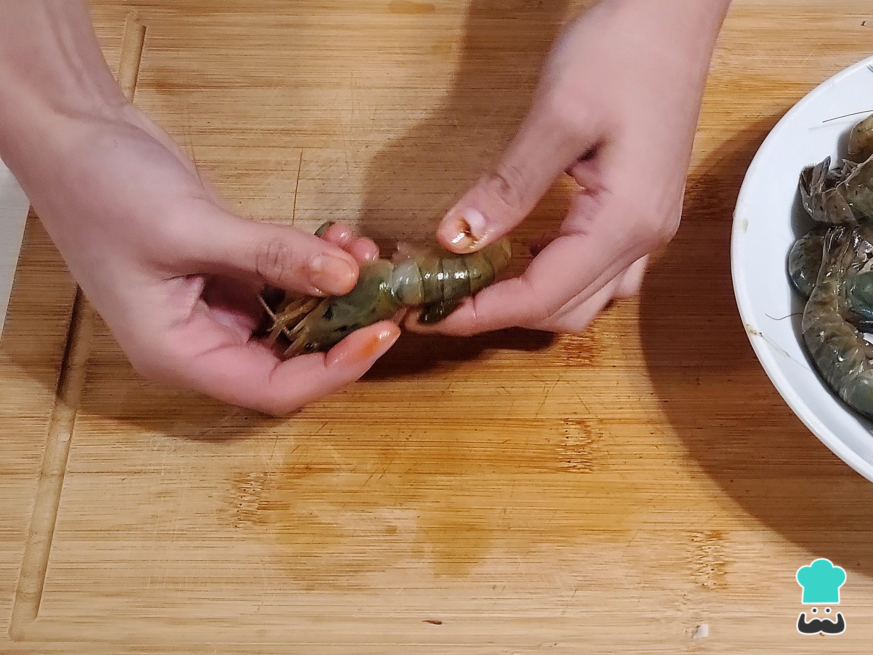 Empieza limpiando los langostinos. Para hacerlo, lávalos y luego retira las cabezas junto con las carcasas que recubren las colas. Después, con un cuchillo, realiza una incisión en la parte dorsal y retira la tira negra que son los intestinos.