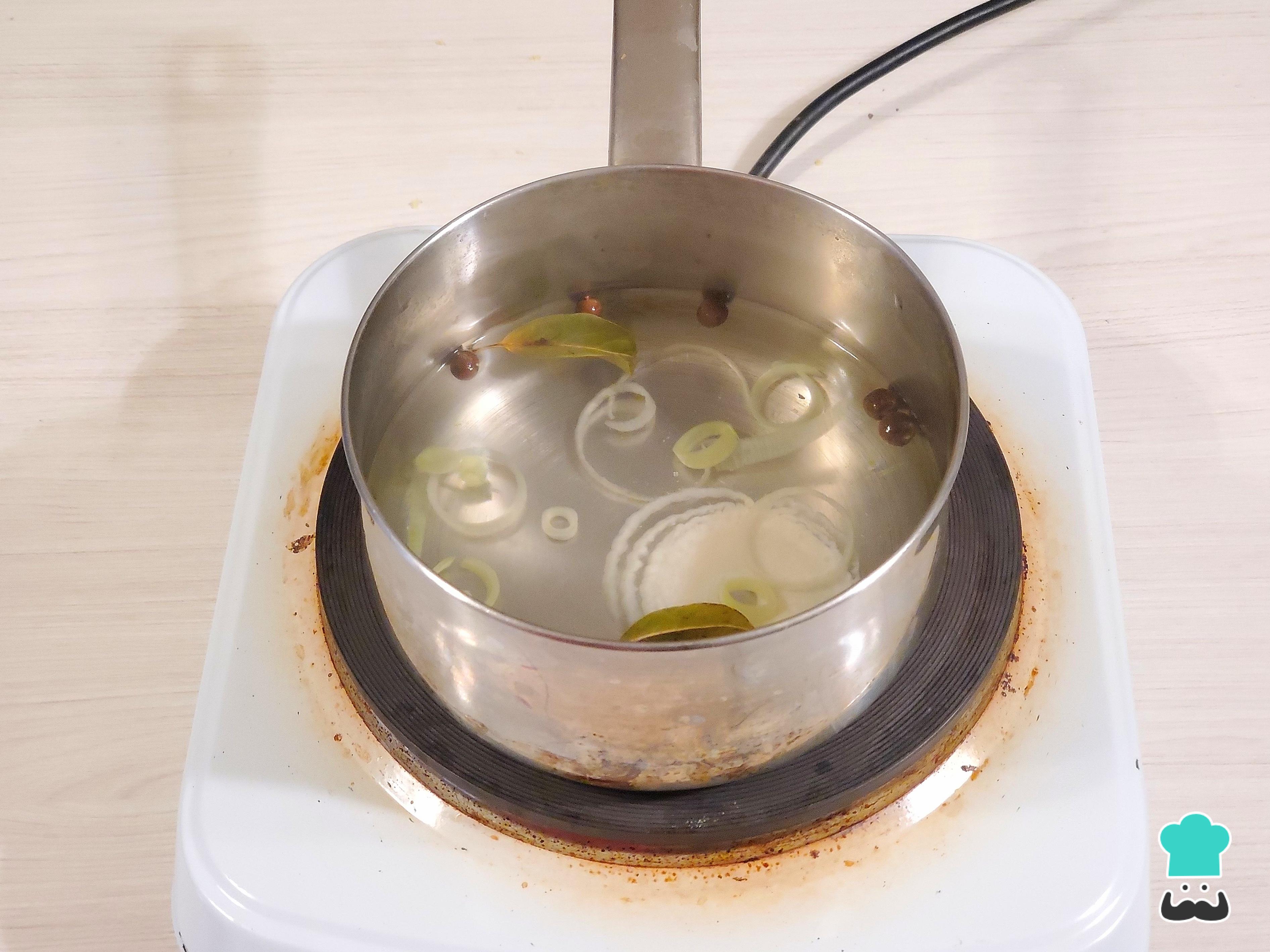 Prepara un caldo colocando agua en una cacerola y aromatízalo con rodajas de poro, un trozo de cebolla, apio, unas hojas de laurel y un par de pimientas enteras, además de sal. Tapa la cacerola y deja que hierva durante al menos 15 minutos.