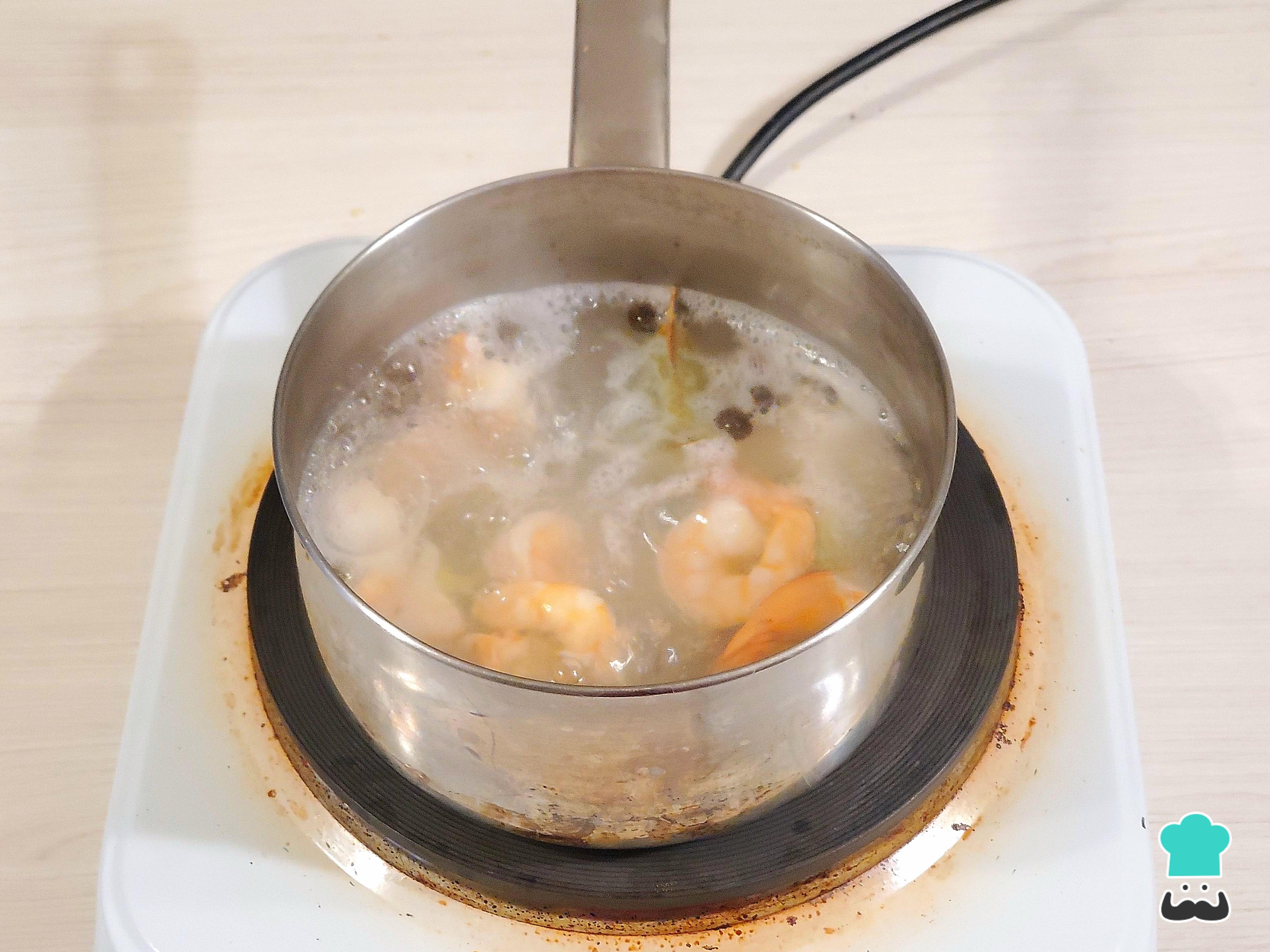 Sumerge las colas de langostinos en este caldo y déjalas cocinar durante 1 minuto hirviendo rápidamente. Luego, retíralas inmediatamente y deja que se enfríen.