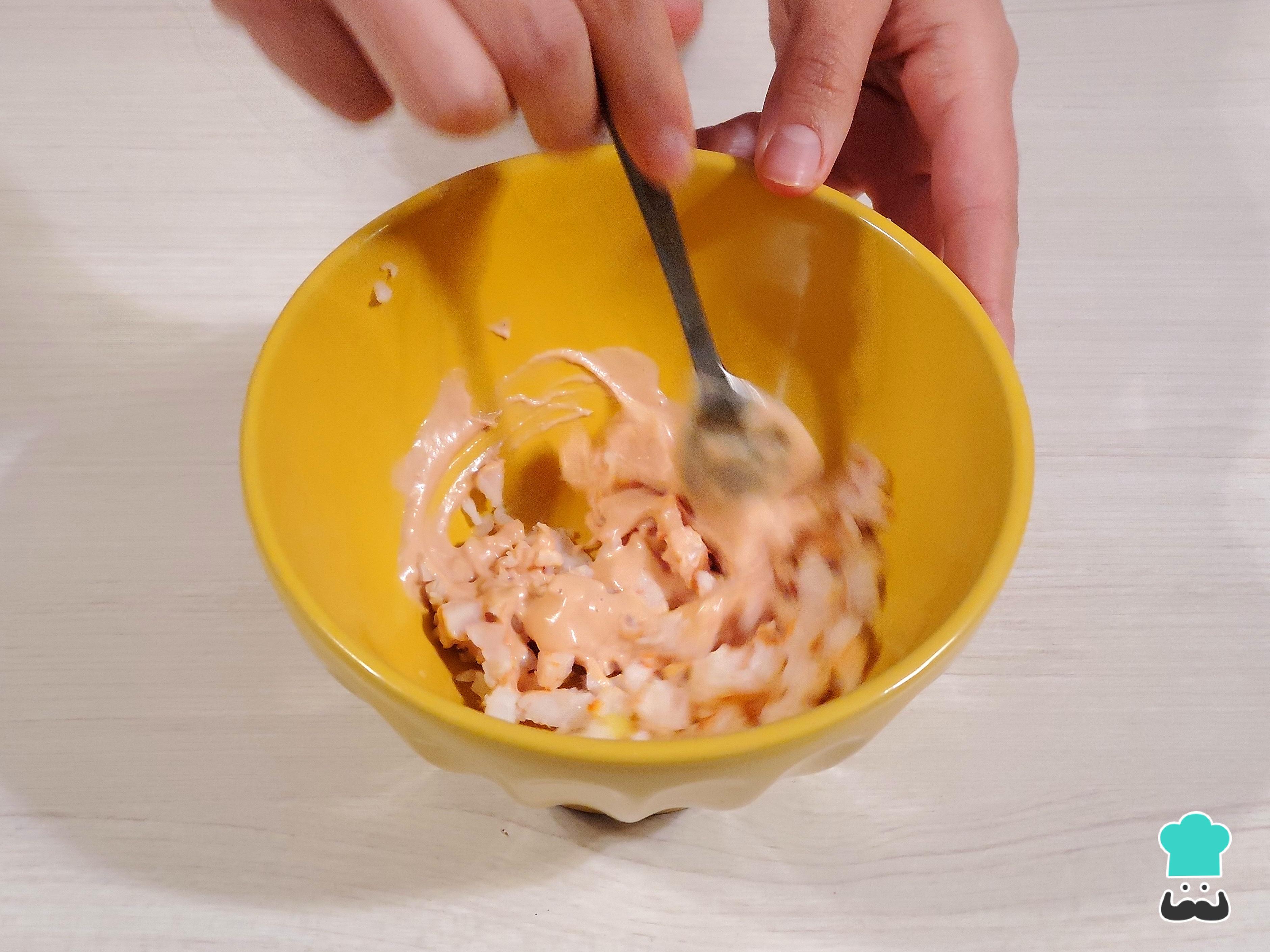 Aparte, prepara una salsa golf mezclando mayonesa y kétchup. Seguidamente, coloca las colas picadas en un bowl pequeño y añade esta salsa. Mezcla bien e incorpora sal al gusto. Reserva.