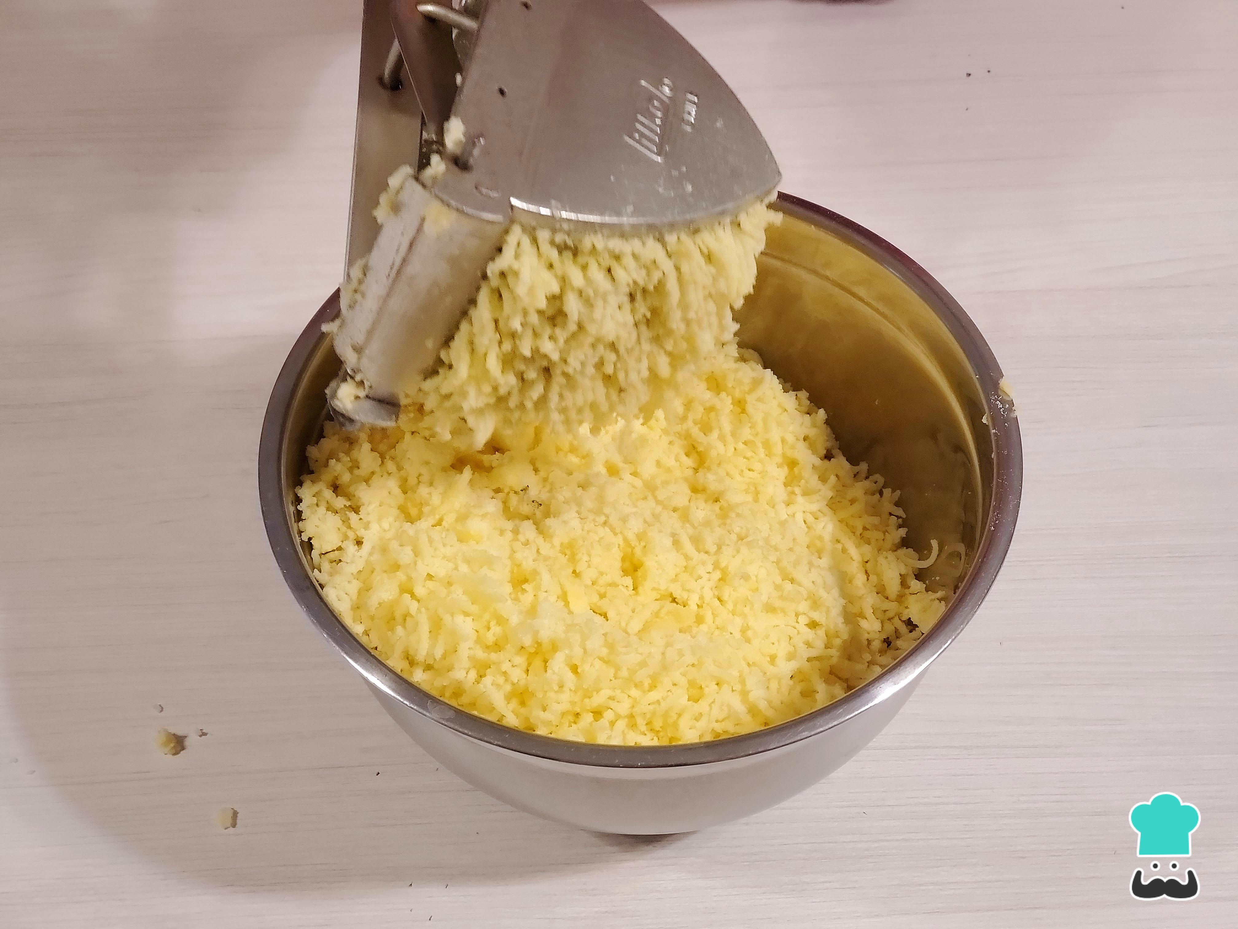 En una olla grande, sancocha las papas amarillas hasta que estén bien cocidas. Luego, retíralas de la olla y pélalas. Inmediatamente, prénsalas aprovechando que aún están suaves. Puedes prensarlas dos veces para que quede una masa más sedosa. Reserva.