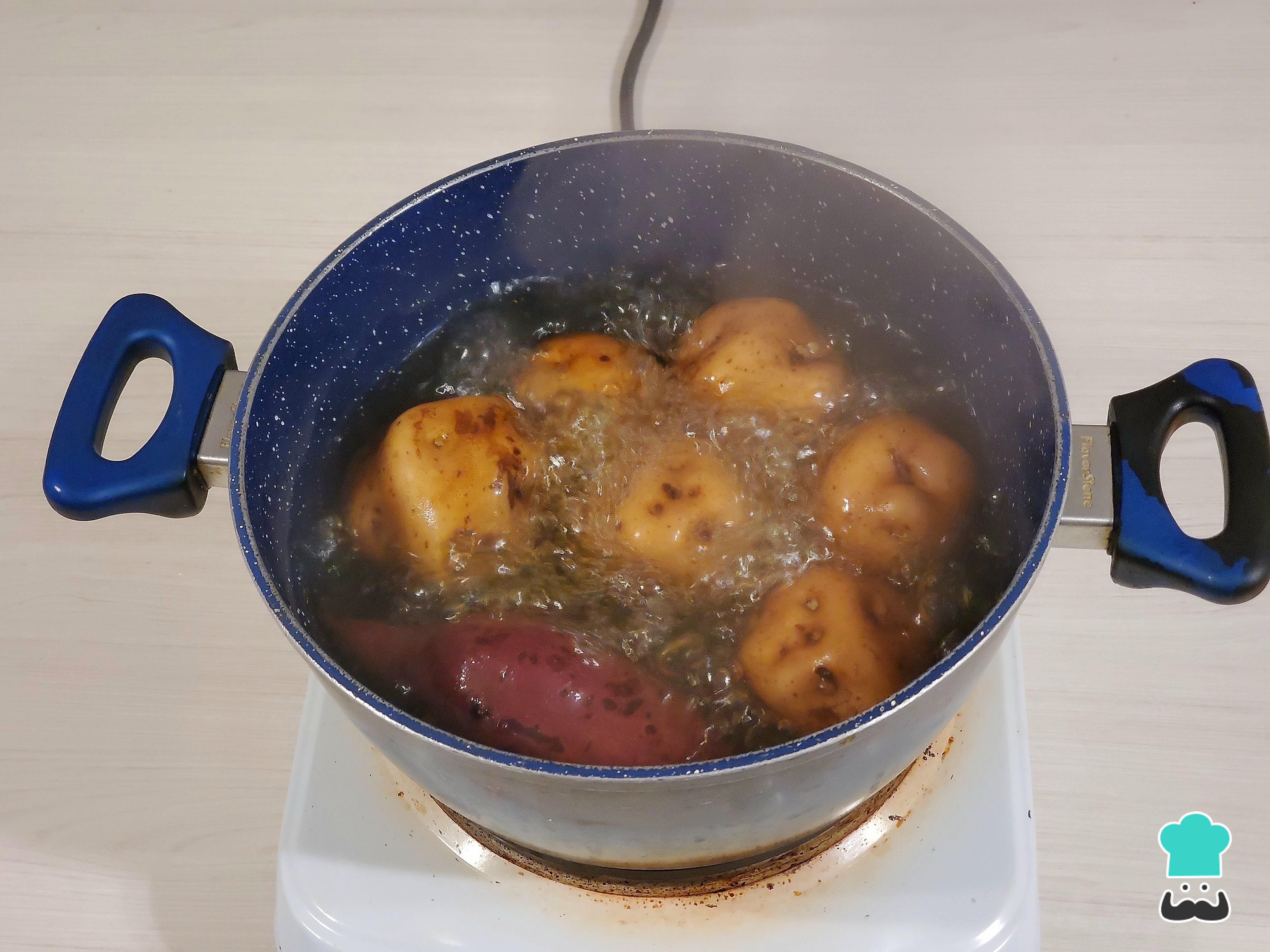 Empieza sancochando las papas y los camotes. Coloca las papas y los camotes bien lavados en una olla con abundante agua fría y un puñado de sal. Tapa la olla y ponla a fuego medio-alto hasta que hierva. Luego, reduce el fuego al mínimo y deja que hiervan por 25 minutos o hasta que estén suaves.