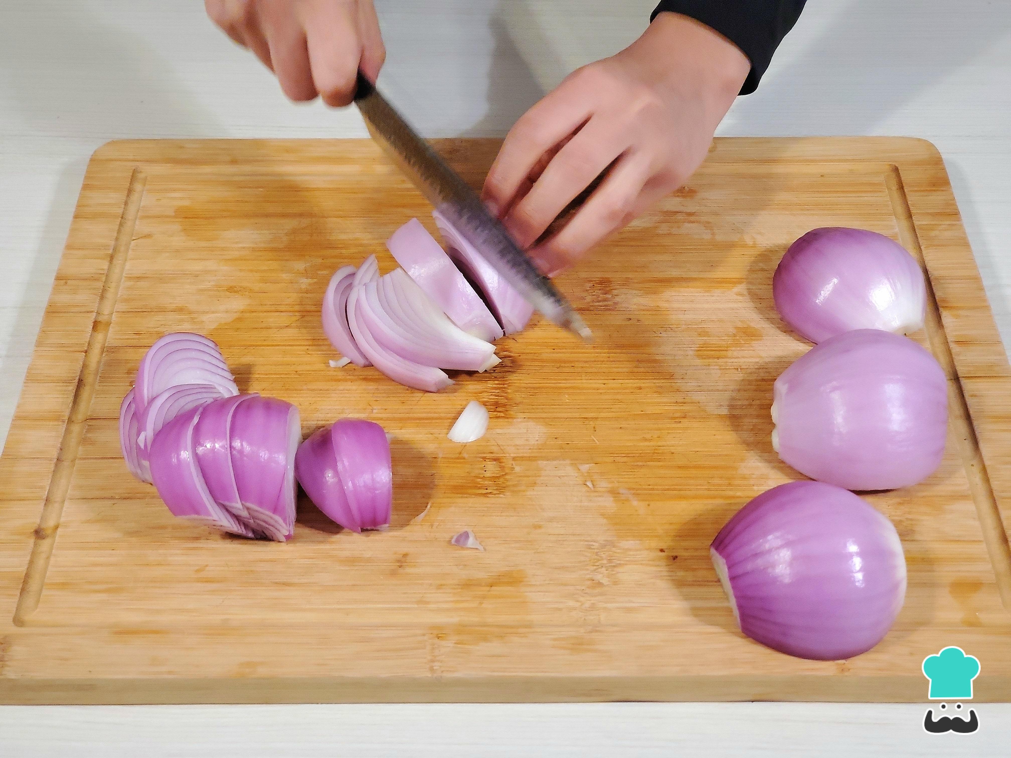Corta la cebolla en gajos o tiras gruesas, retirando el corazón, y colócalas en un bowl grande.