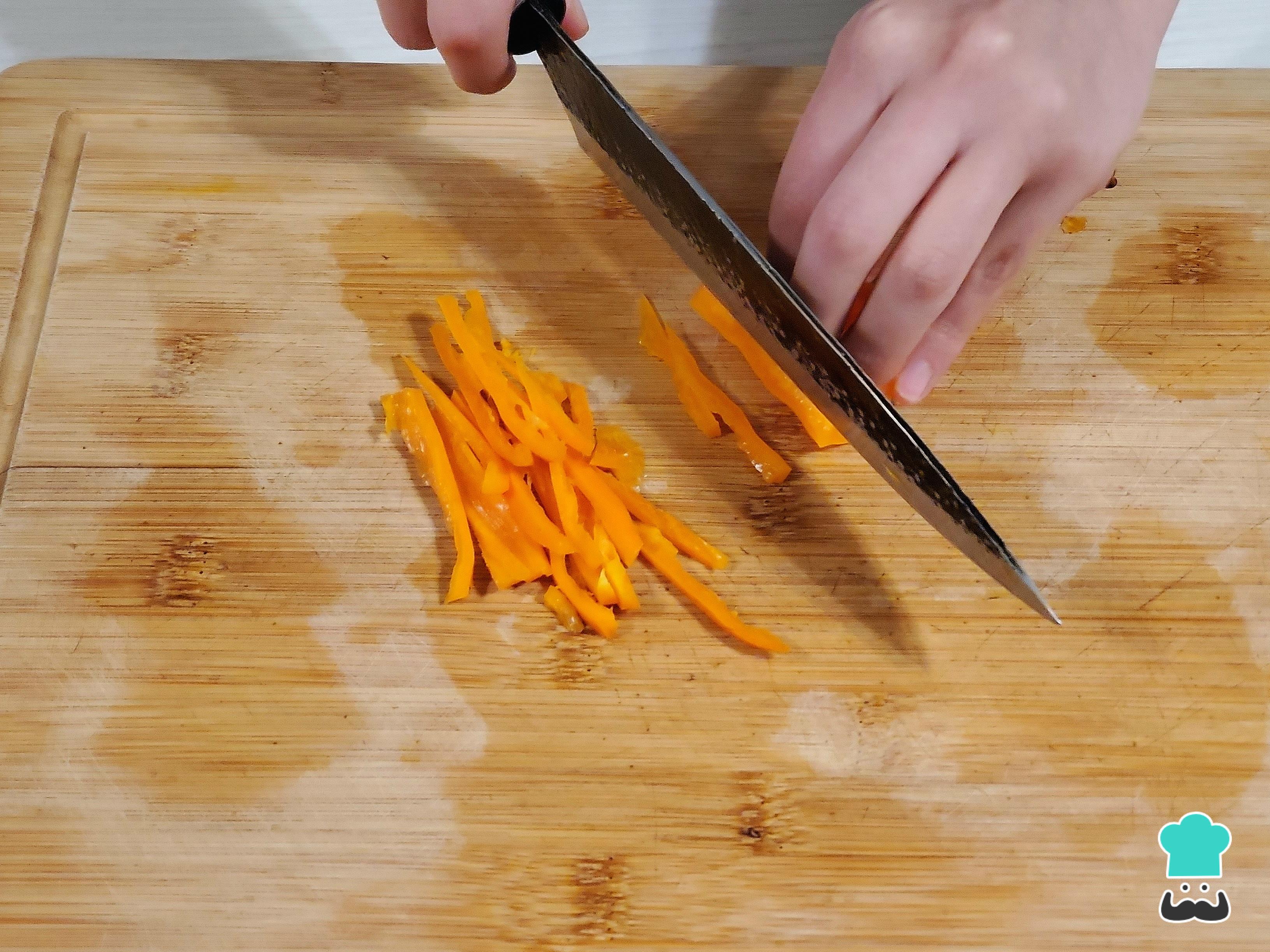 Pica los ajíes despepitados en juliana delgada y resérvalos junto con las cebollas.