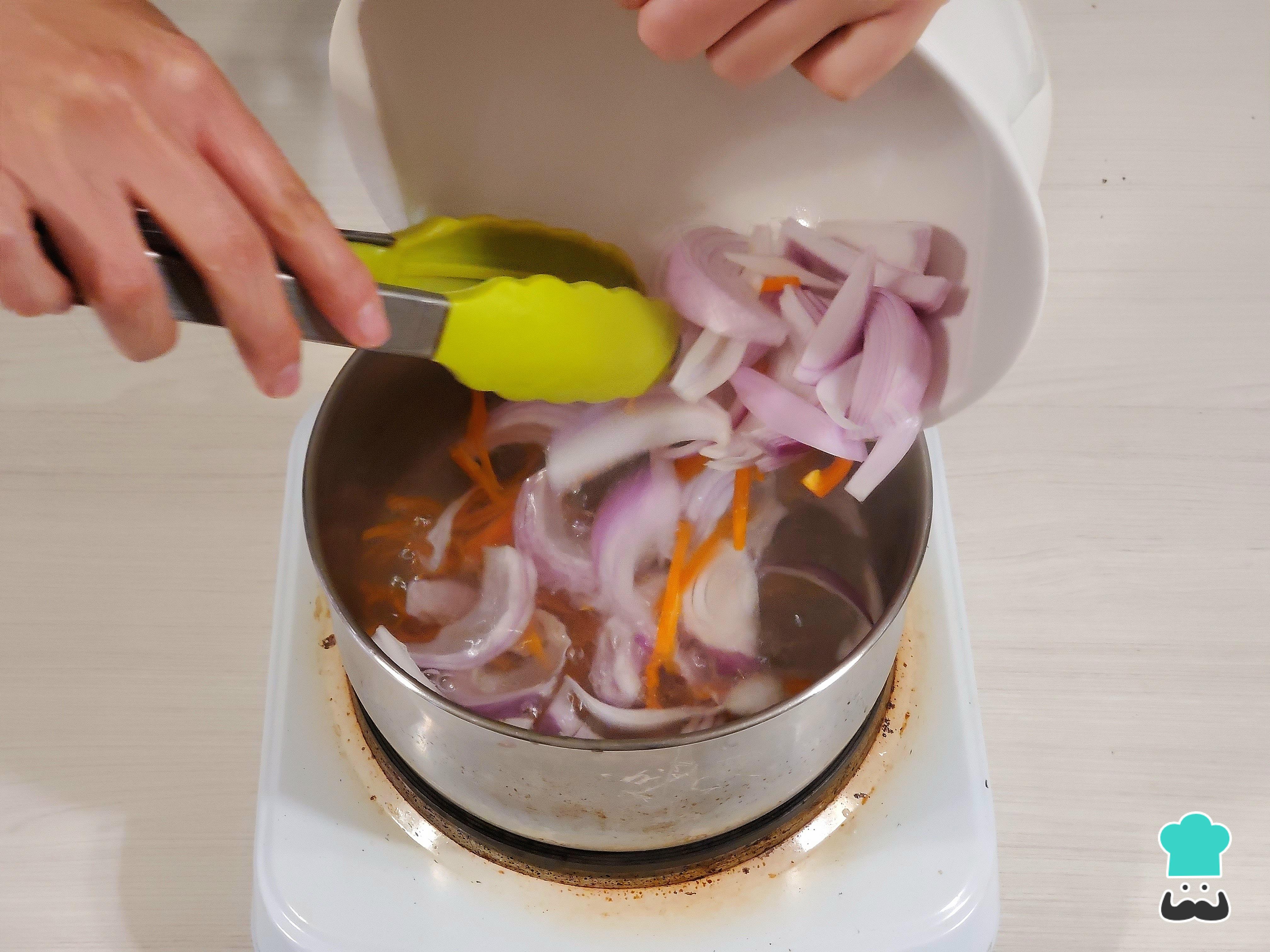 Pon a calentar una olla con abundante agua y, cuando hierva, vierte las cebollas y ajíes picados. Deja que se cocinen hasta que las cebollas se vean translúcidas. Luego, retira del agua y escurre.