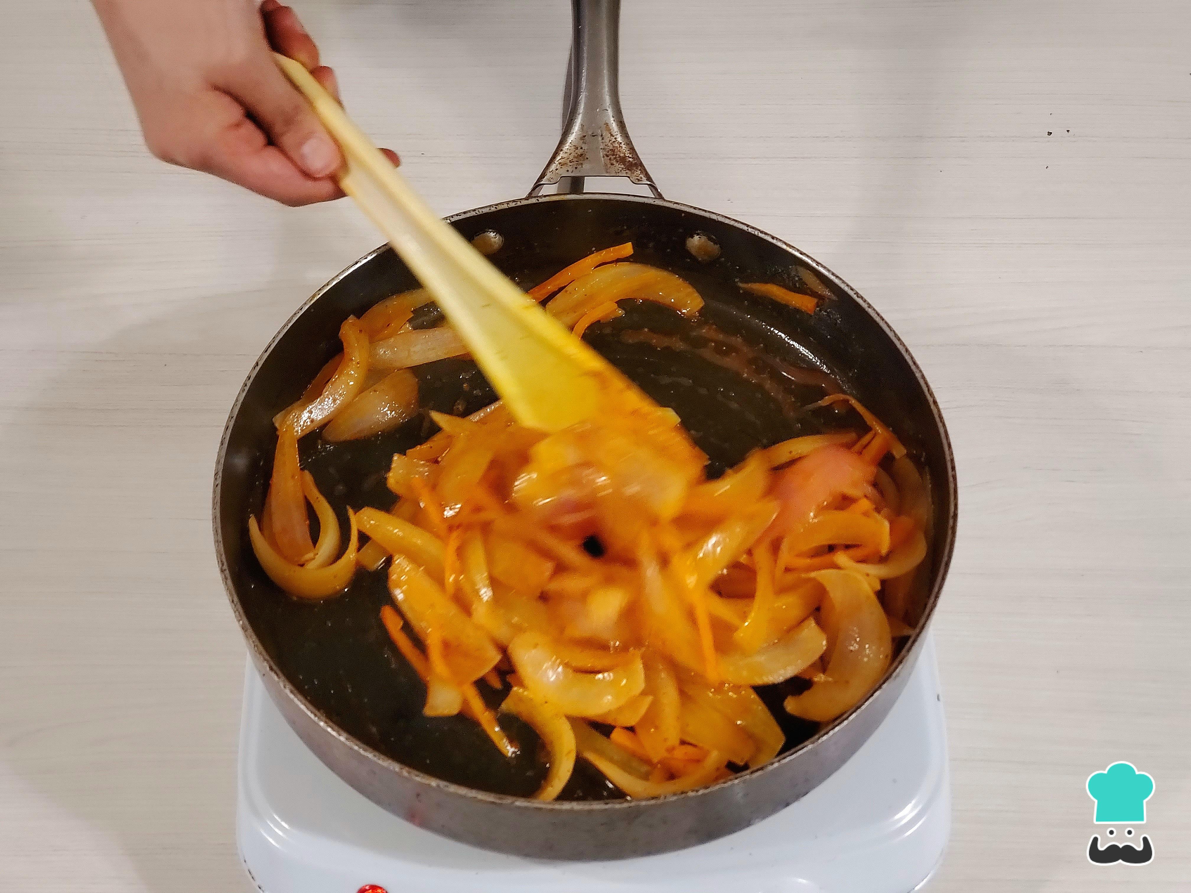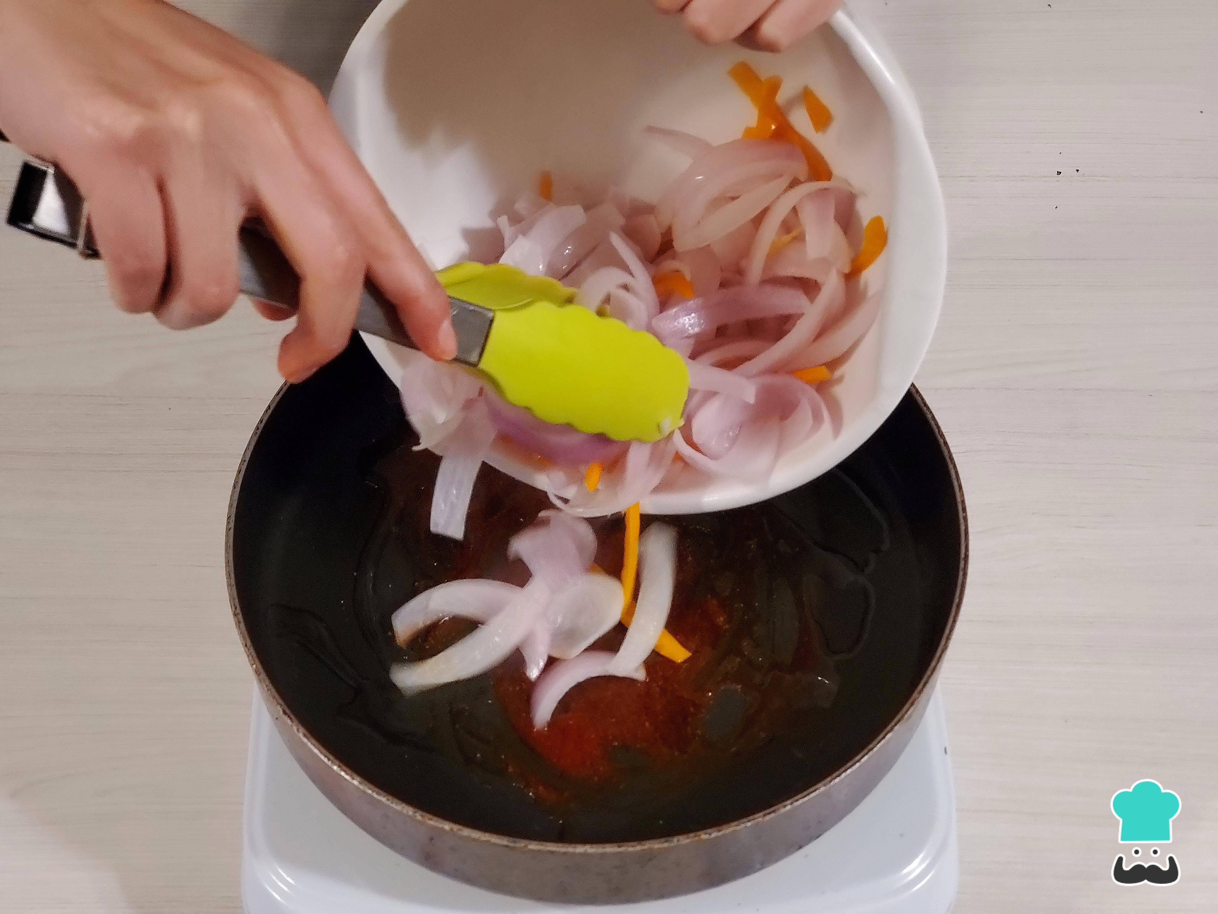 Calienta una sartén, vierte un buen chorro de aceite y adereza con achiote en polvo. Remueve y, luego, integra las cebollas y ajíes blanqueados.