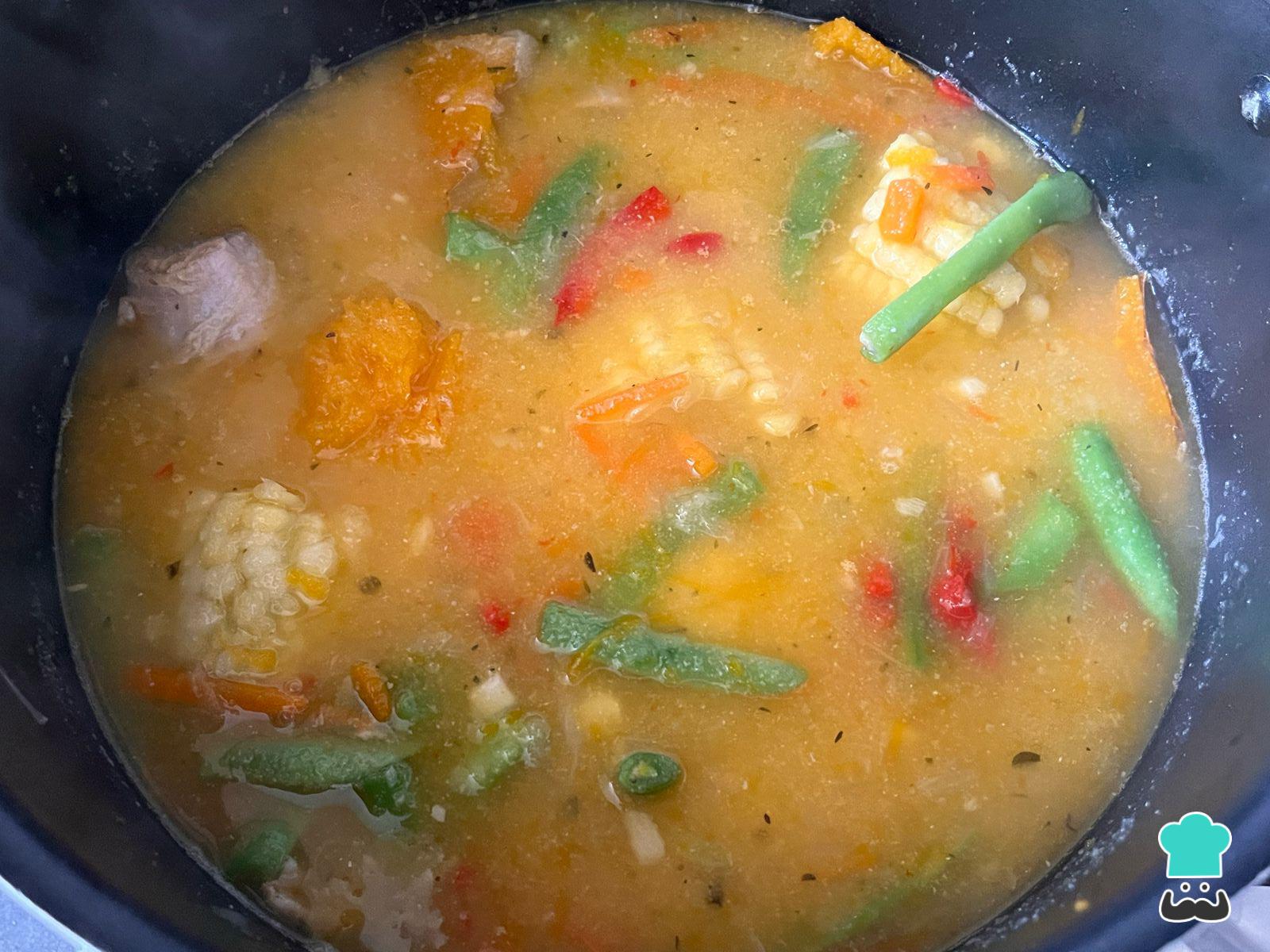Añade la mezcla de chuchoca a la olla para espesar y mezcla bien, cocina por 5 minutos más. Verifica el sabor y de sal. Si te quedó muy espesa, añade más agua. Si crees que falta más consistencia añade más chuchoca.