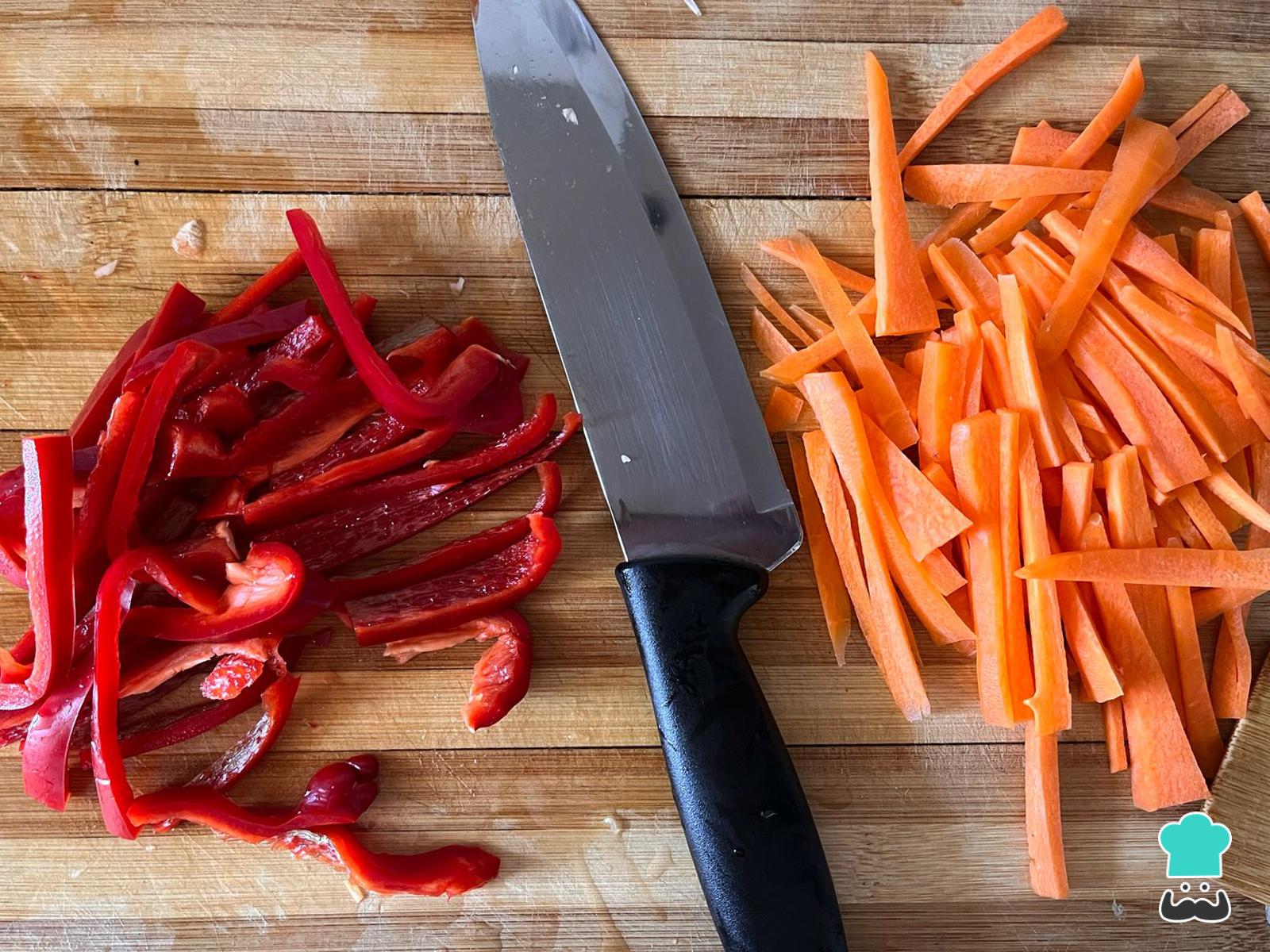 Corta finamente el pimentón y pela y corta la zanahoria.