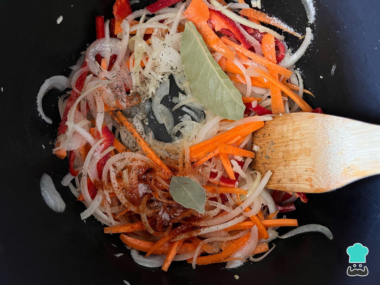 Agrega la zanahoria y pimentón a la olla, añade las especias: ají color, tomillo, orégano, laurel o apio, sal y comino, sofríe por unos minutos más.