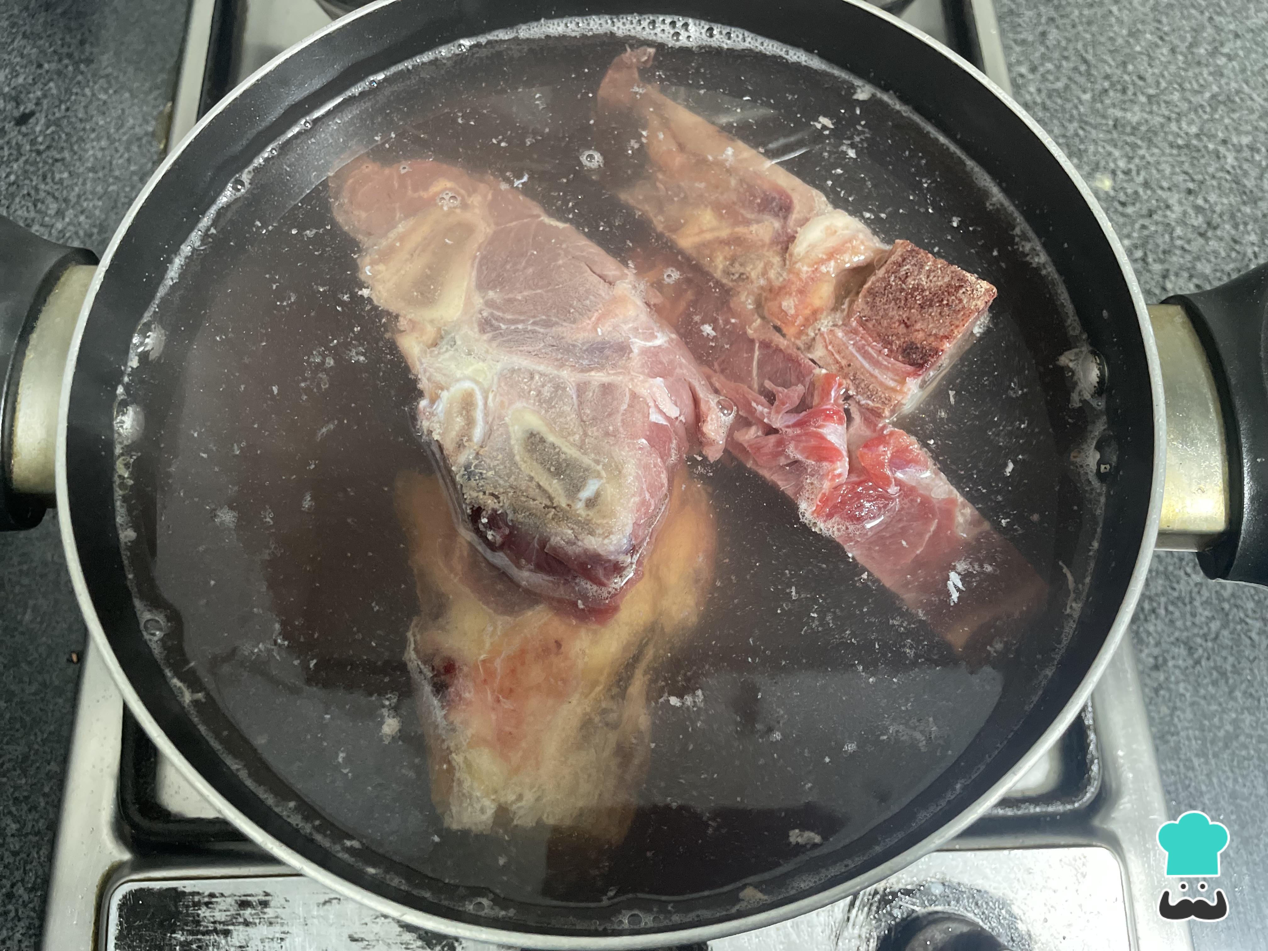 En una olla grande coloca los huesitos de vacuno junto con el agua y la cebolla. Lleva a ebullición y, luego, baja el fuego. Cocina a fuego lento durante aproximadamente 1 hora retirando la espuma que se forme en la superficie.
