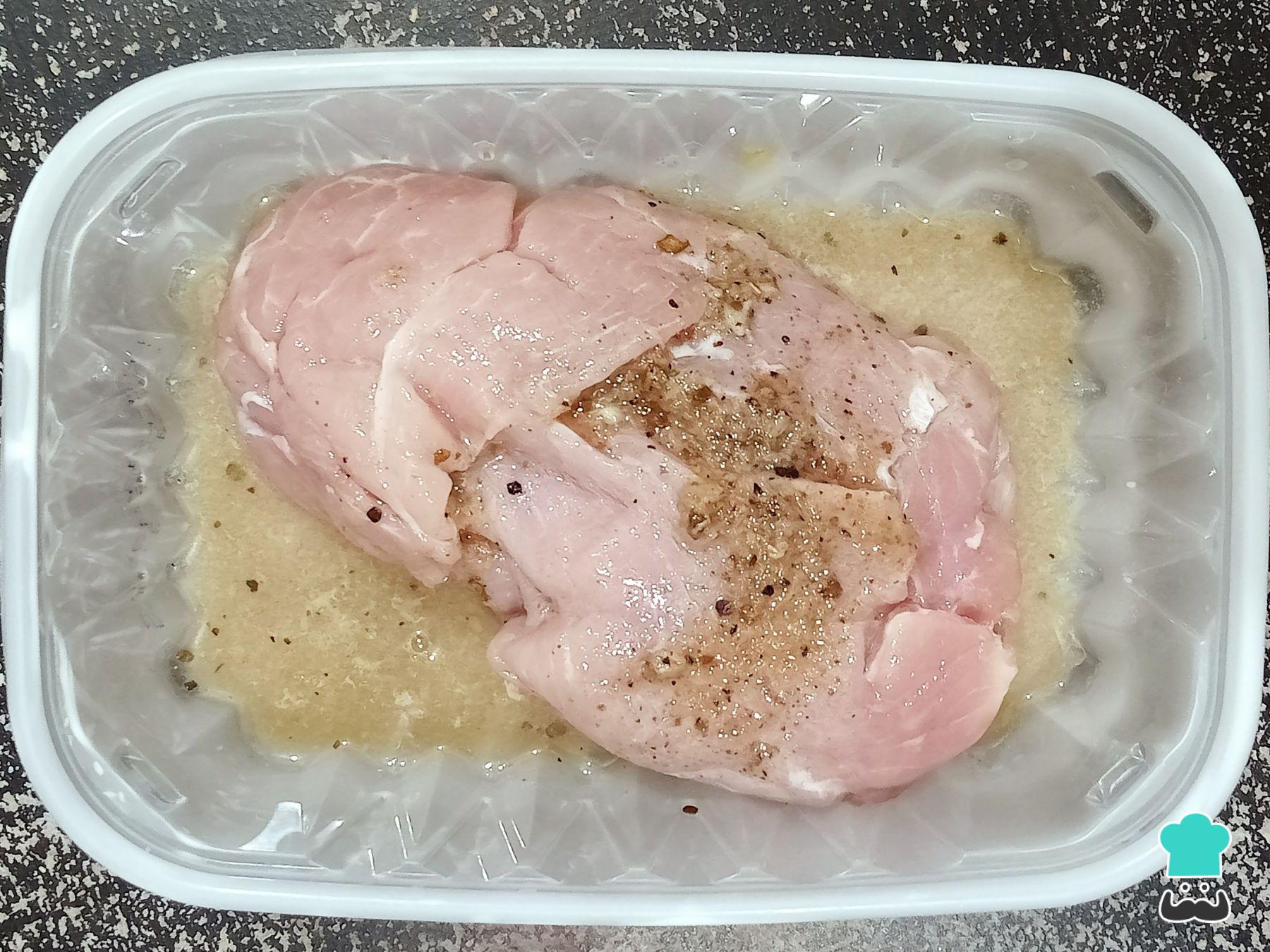 Para comenzar, marina las milanesas de cerdo con el vinagre de manzana, la sal, la pimienta molida y el ajo en polvo. Incorpora todo muy bien de manera que las milanesas queden bien impregnadas de esta mezcla, deja reposar por 30 minutos en el refrigerador.