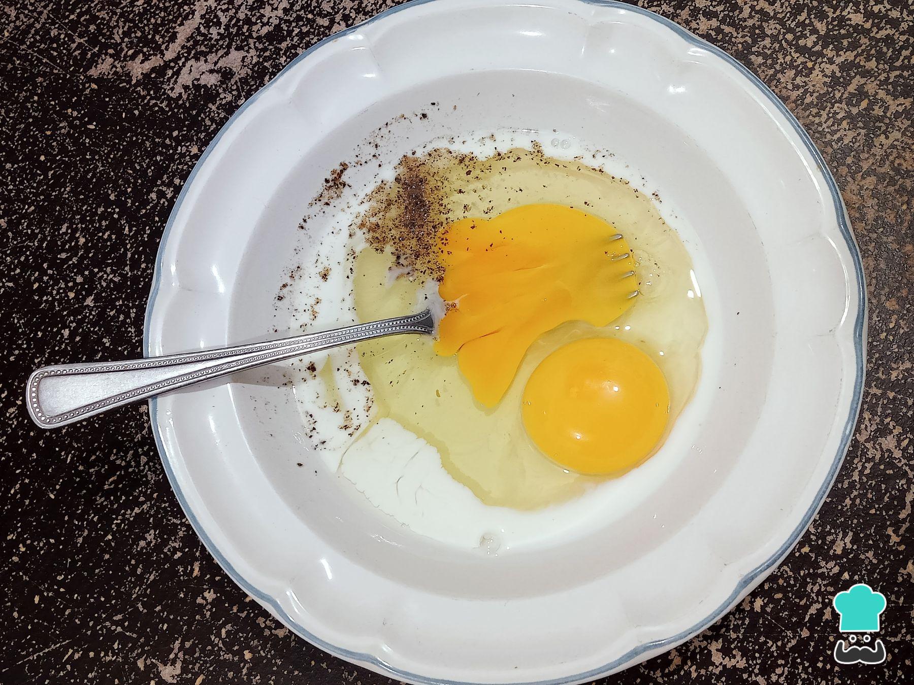 Transcurrido el tiempo de reposo, bate 2 huevos junto con 1 chorro de leche, añade 1 pizca de sal y pimienta y pasa las milanesas por el batido de huevo una a una.