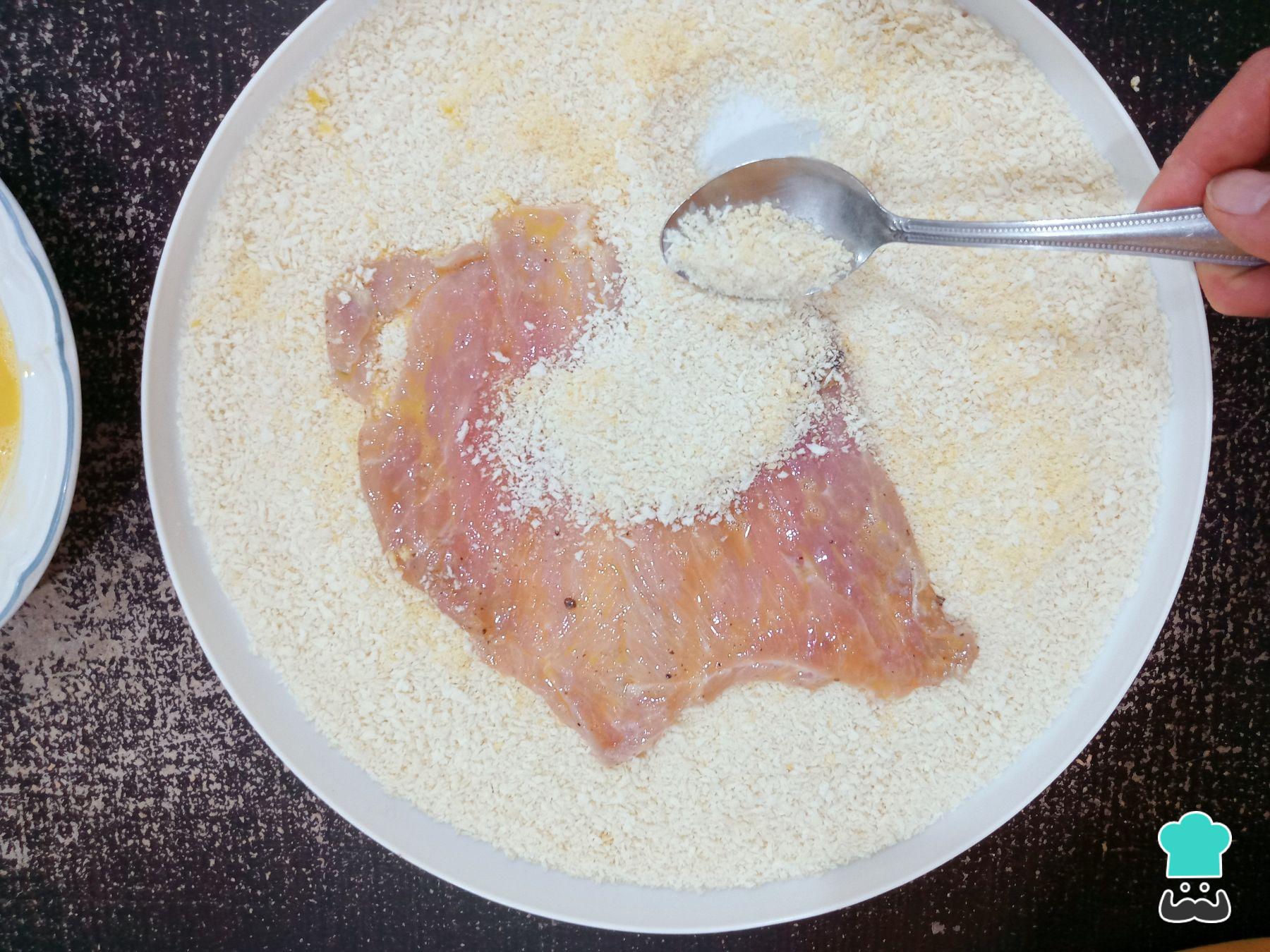 Pasa las milanesas por el pan molido y cubre muy bien por ambos lados, apretando un poco la carne de cerdo, de manera que el pan molido se quede bien pegado.
