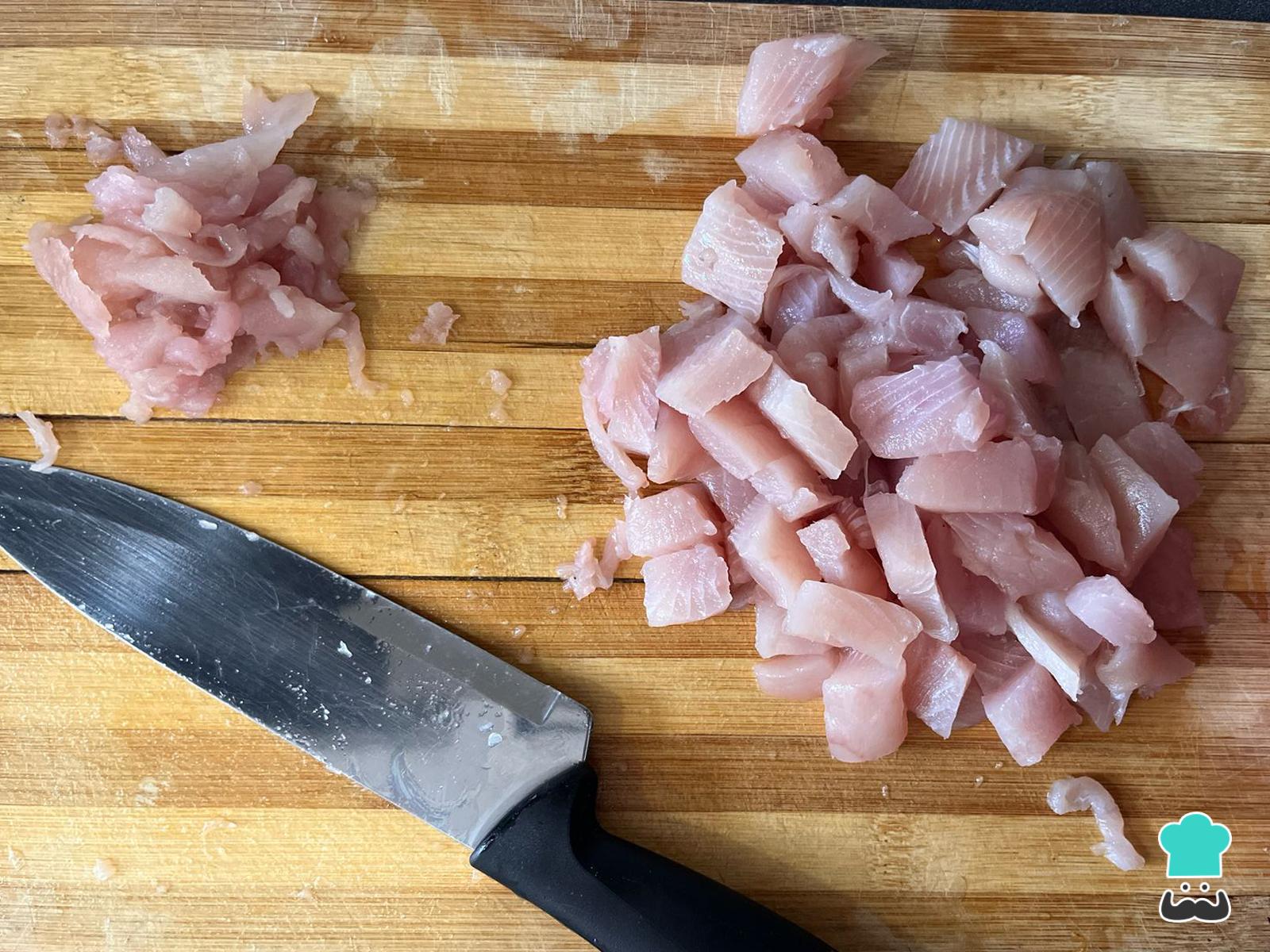 Corta los filetes de reineta en cubos, el corte debe ser en diagonal.