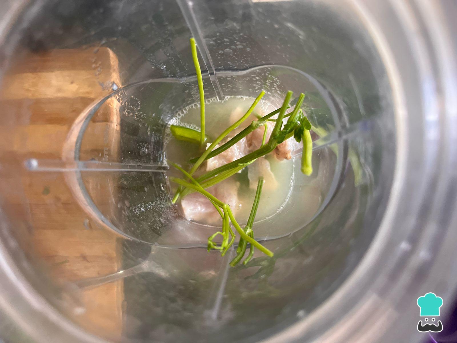 Para hacer la leche de tigre para el ceviche, añade en una licuadora el ajo, jengibre, cebolla, tallos de cilantro y apio, ají (si usas), caldo de pescado o agua, jugo de limón, y una o dos cucharadas de la reineta en cubos.