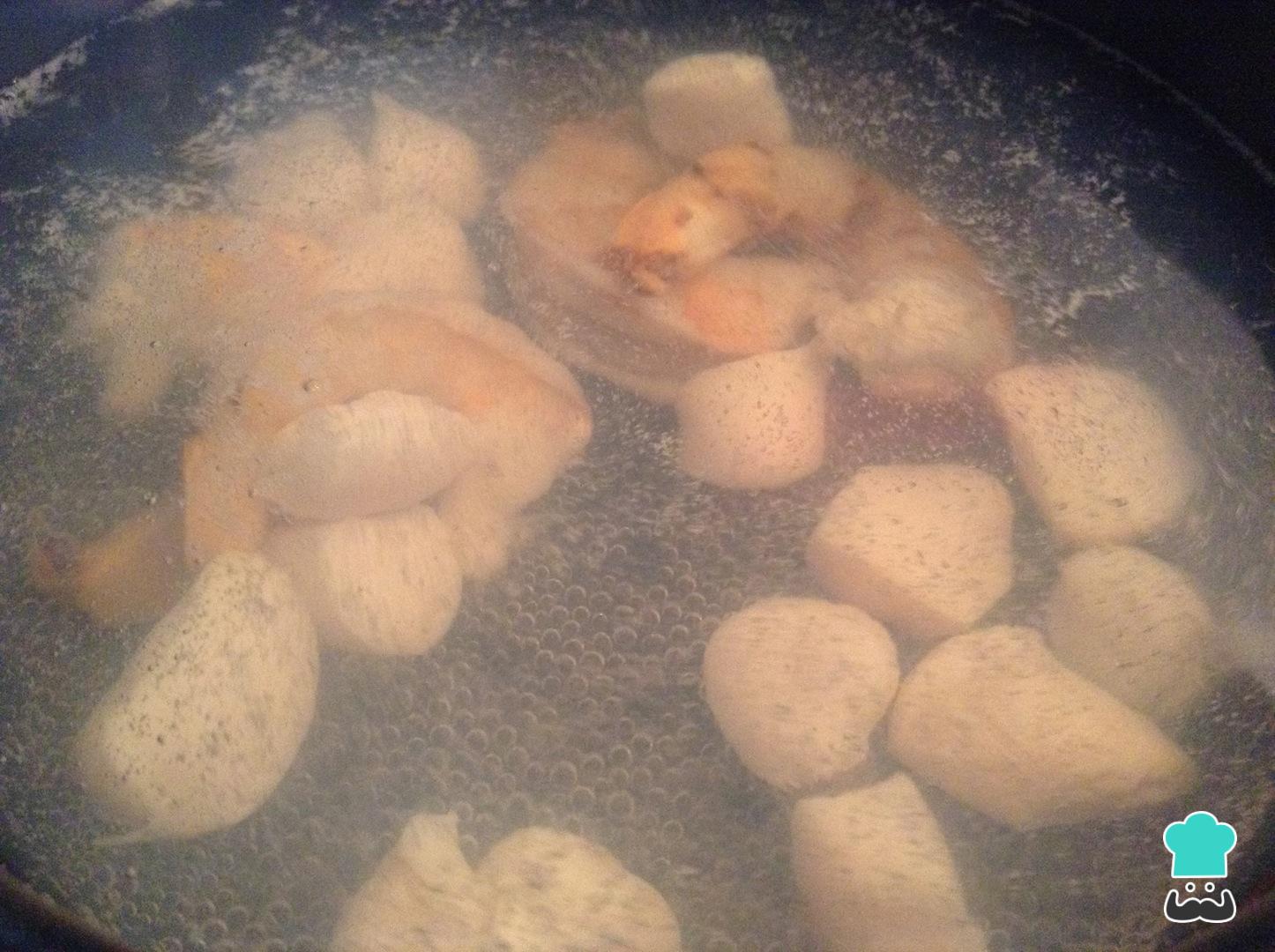 Lo primero que vamos hacer es limpiar las gambas o langostinos, retirando la cáscara que las recubre y quitando la vena del lomo, ya que este es el intestino del animal. Hecho esto, lleva una olla honda con suficiente agua a fuego medio, cuando alcance el punto de ebullición agrega todos los mariscos y deja cocinar por 30 segundos, retira de inmediato y corta la cocción con agua fría para evitar que se sobrecocinen.