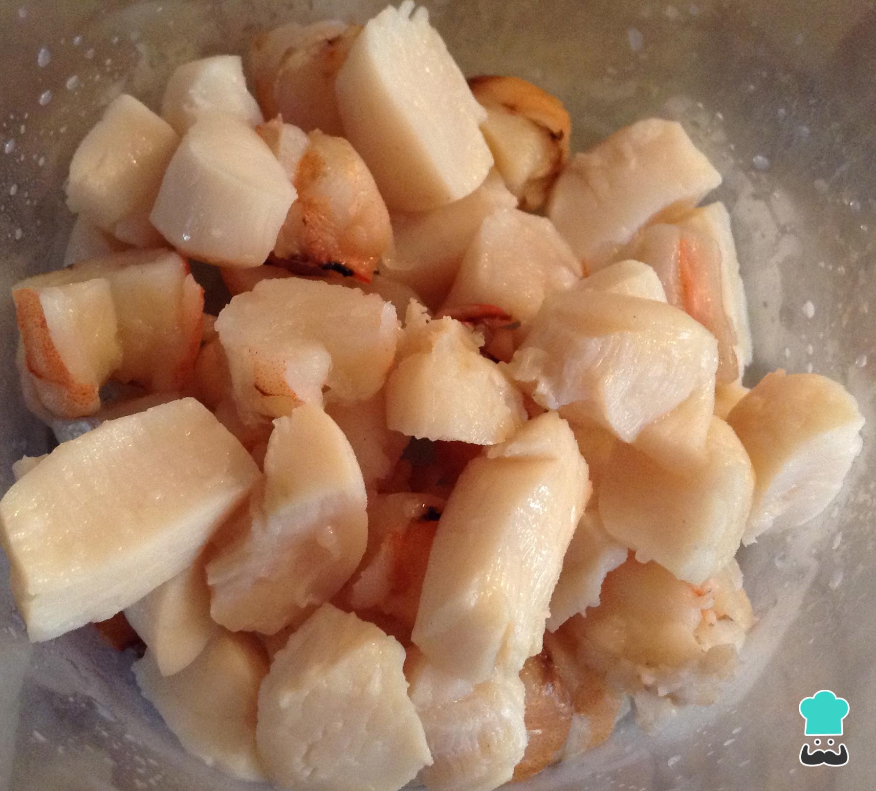 Una vez que los mariscos estén fríos, córtalos en trozos medianos (reserva cuatro langostinos o gambas para decorar los platos) y llévalos a un bol para mezclarlos con el resto de ingredientes y continuar con la elaboración del ceviche de vieiras.