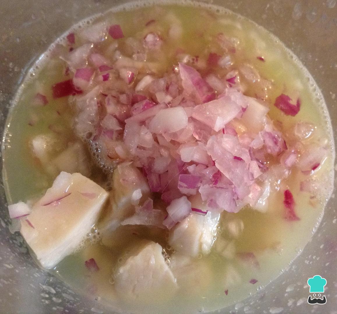Adiciona la cebolla morada finamente picada y el zumo de los limones. Deja marinar en este líquido durante 15 minutos aproximadamente.